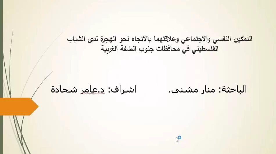 مناقشة رسالة ماجستير حول التمكين النفسي والاجتماعي وعلاقتهما بالاتجاه نحو الهجرة لدى الشباب الفلسطيني في محافظات جنوب الضفة الغربية