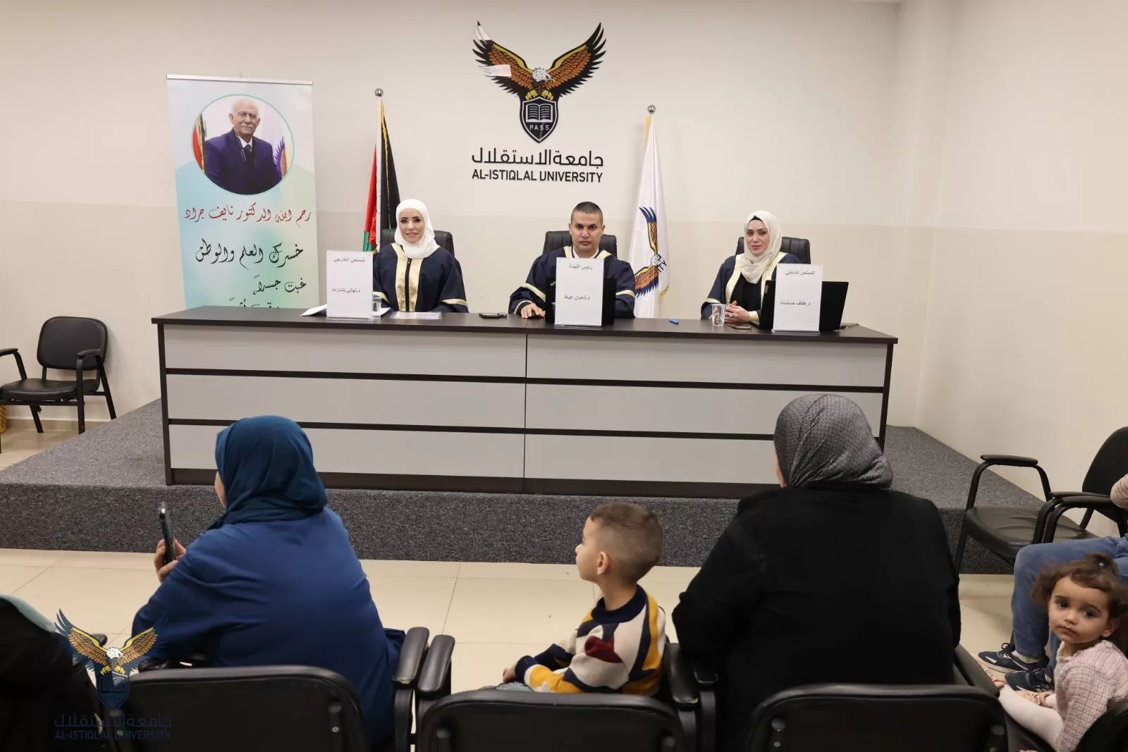 وتكونت لجنة المناقشة من د.شعبان عياط ( مشرفاً )، و د.عفاف حساسنة (ممتحناً داخلياً)، و د. تهاني بشارات(ممتحناً خارجياً).