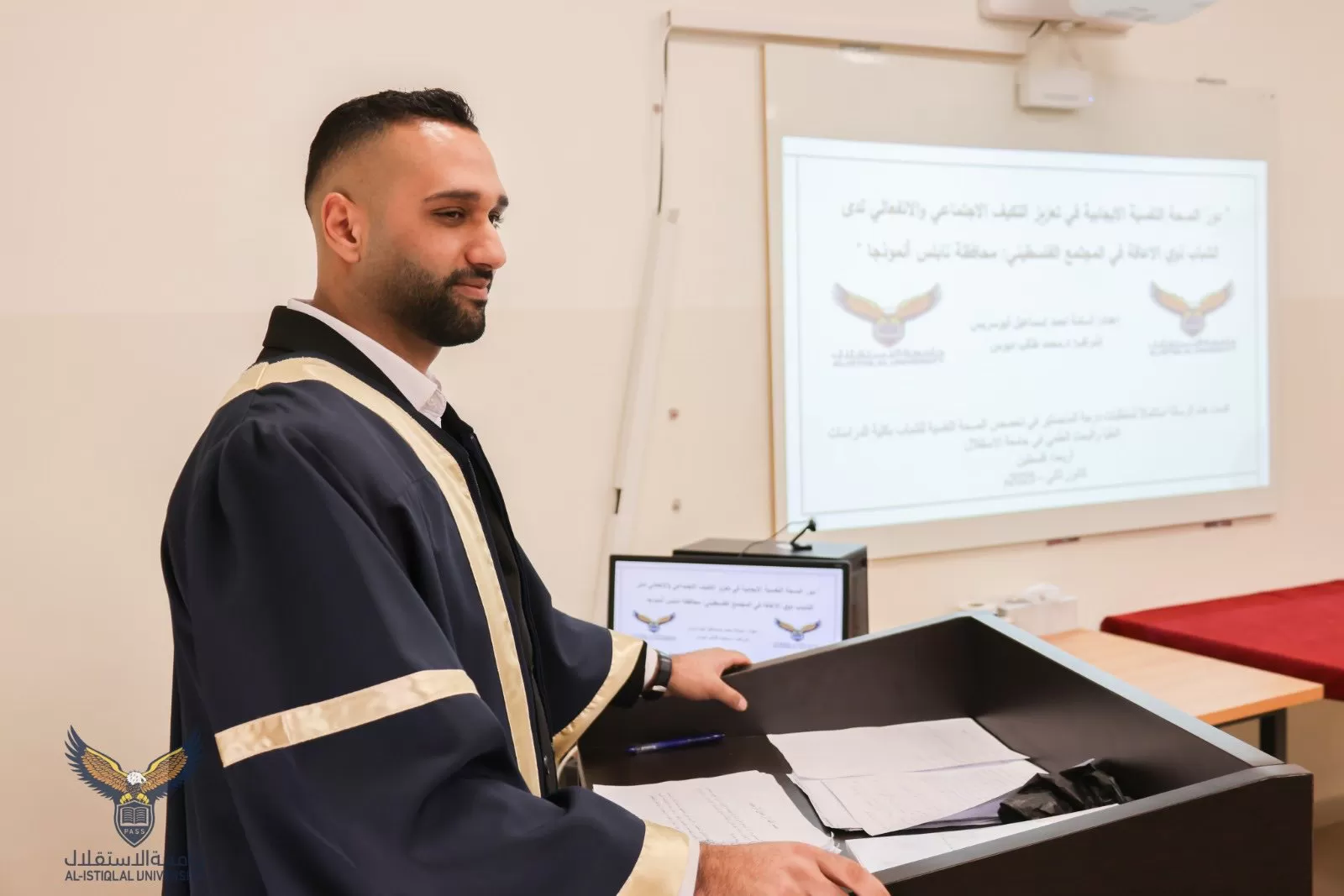 ناقشت كلية الدراسات العليا والبحث العلمي- قسم الصحة النفسية للشباب في جامعة الاستقلال رسالة ماجستير تقدّم بها الطالب أسامة أبو سريس الموسومة ب "دور الصحة النفسية الإيجابية في تعزيز التكيف الاجتماعي والانفعالي لدى الشباب ذوي الإعاقة في المجتمع الفلسطيني- محافظة نابلس أنموذجًا".