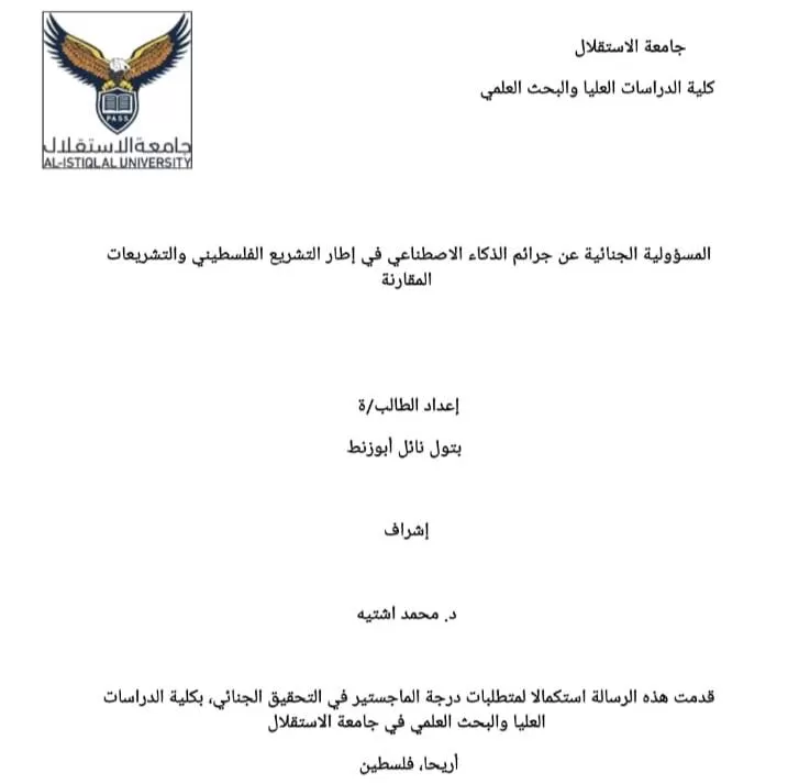 ناقشت كلية الدراسات العليا والبحث العلمي في جامعة الاستقلال اليوم الإثنين رسالة ماجستير الكترونياً للطالبة بتول نائل أبو زنط والموسومة المسؤولية الجنائية عن جرائم الذكاء الاصطناعي في إطار التشريع الفلسطيني والتشريعات المقارنة.
