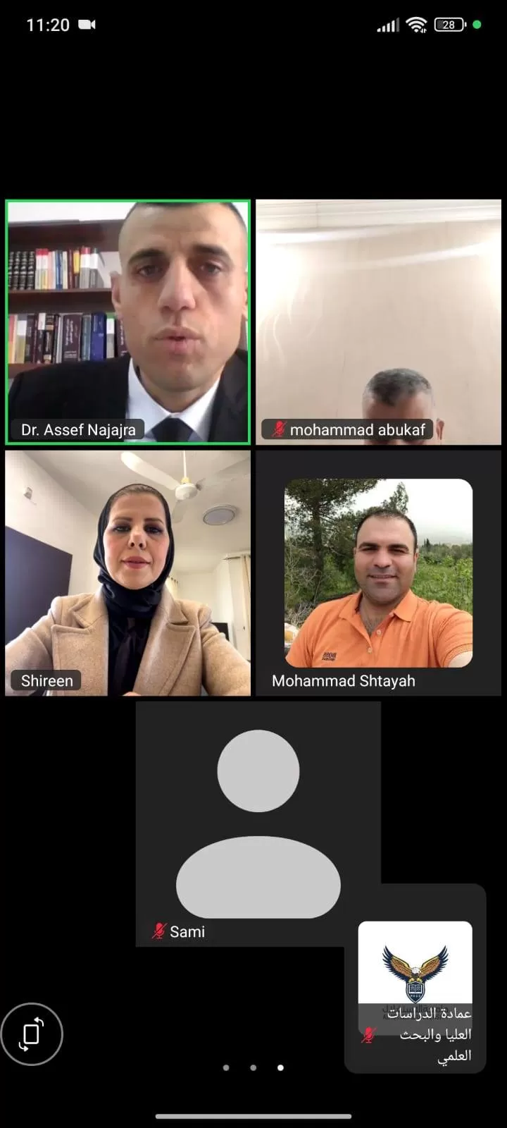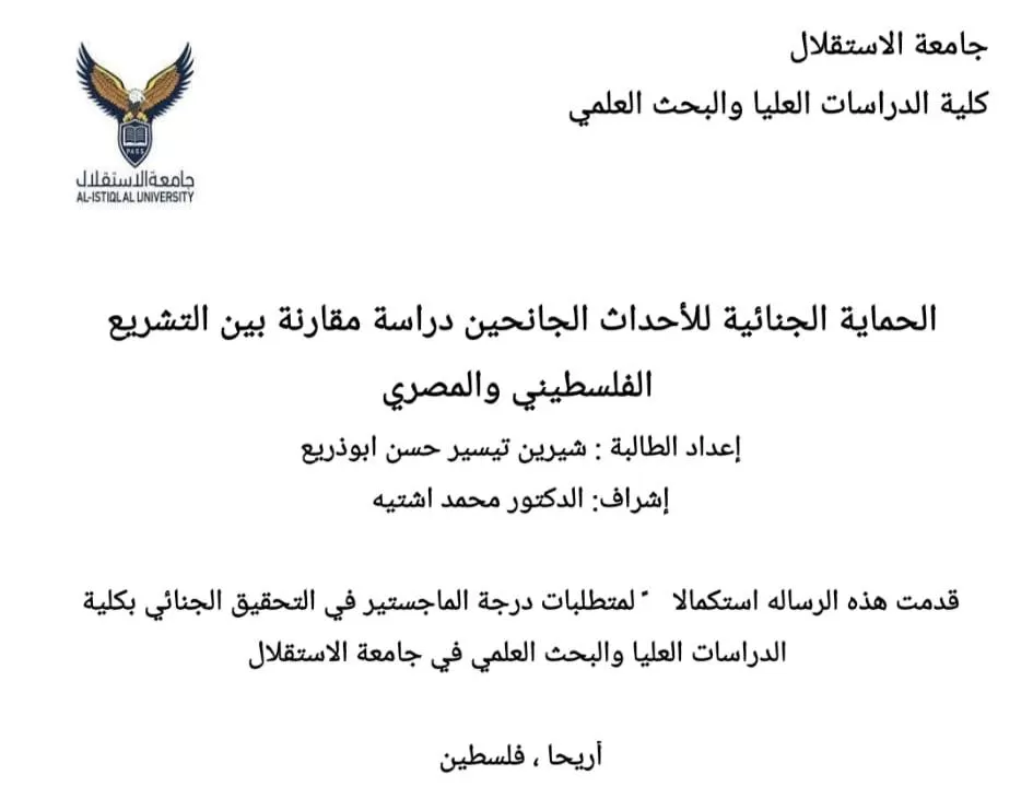 ناقشت كلية الدراسات العليا والبحث العلمي في جامعة الاستقلال يوم الأحد رسالة ماجستير الكترونياً للطالبة شيرين تيسير حسن ابوذريع والموسومة الحماية الجنائية للأحداث الجانحين دراسة مقارنة بين التشريع الفلسطيني والمصري