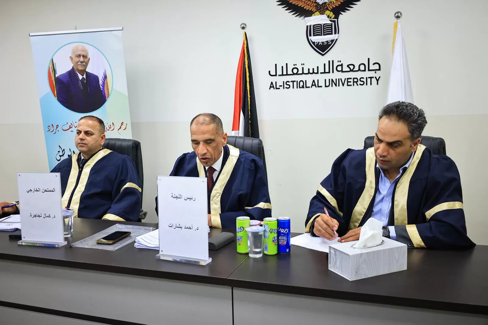 وتكوّنت لجنة المناقشة من: د. أحمد بشارات مشرفًا على الرسالة، د. محمد عبدو ممتحنًا داخليًا، د. كمال نجاجرة ممتحنًا خارجيًا.
