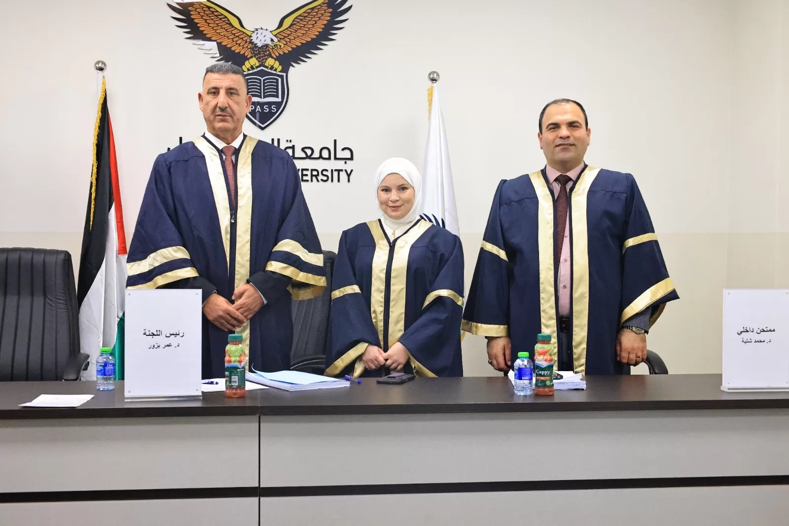 وتكونت لجنة المناقشة من د. عمر بزور مشرفًا على الرسالة، د. مجد عبد الله ممتحنًا خارجيًا، د.محمد شتية ممتحنًا داخليًا.