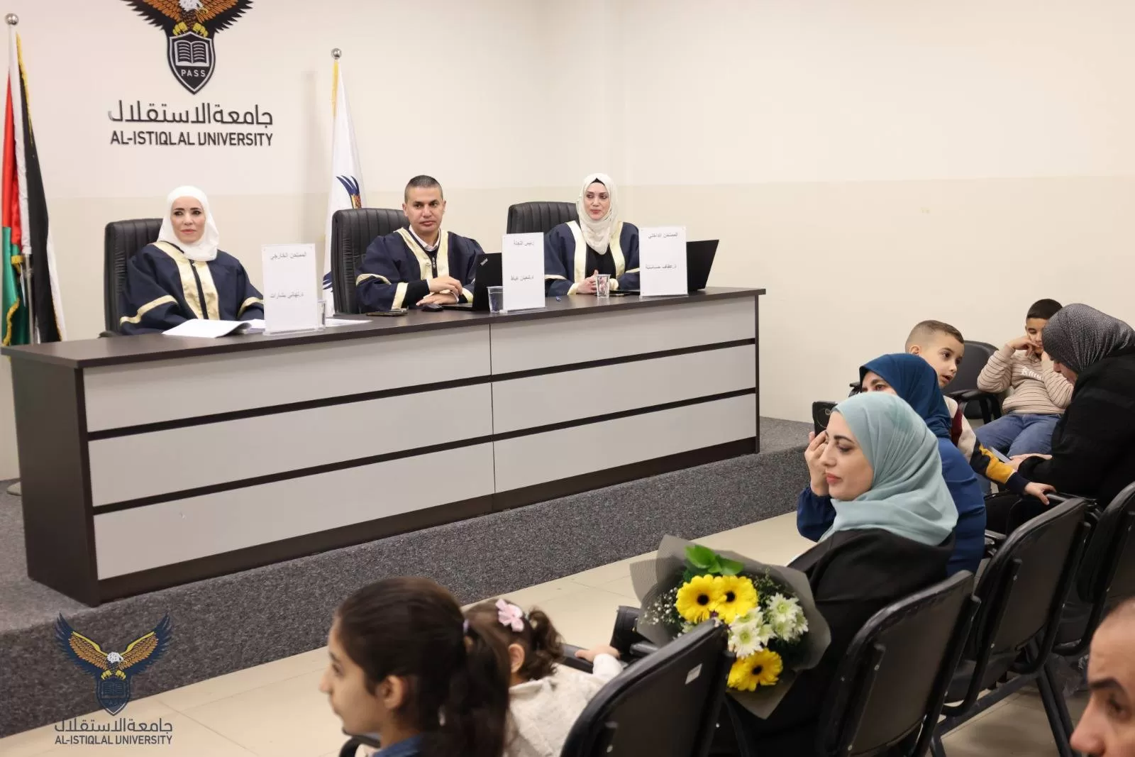 وتكونت لجنة المناقشة من د.شعبان عياط ( مشرفاً )، و د.عفاف حساسنة (ممتحناً داخلياً)، و د. تهاني بشارات(ممتحناً خارجياً).