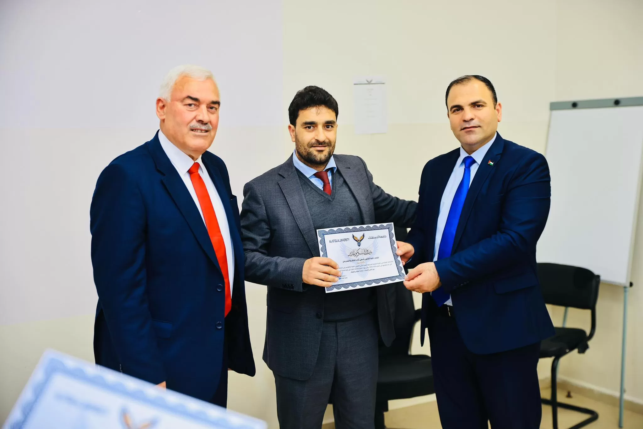 في خطوة لتشجيع البحث العلمي ودعم التميز، كرمت جامعة الاستقلال، اليوم الثلاثاء، الطلبة الفائزين بالمراكز الثلاث الأولى المشاركة بمسابقة التميز البحثي القانوني التي نظمتها كلية القانون بالتعاون مع مؤسسة الحق وكليات الحقوق في الجامعات الفلسطينية (النجاح، بيرزيت، الخليل، القدس، العربية الأمريكية، فلسطين الأهلية، الكلية العصرية)، إلى جانب أعضاء اللجنتين العلمية والتحضيرية.