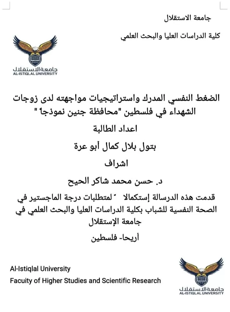 ناقشت كلية الدراسات العليا والبحث العلمي في جامعة الاستقلال اليوم الثلاثاء رسالة ماجستير للطالبة بتول بلال أبو عرة والموسومة الضغط النفسي المدرك واستراتيجيات مواجهته لدى زوجات الشهداء في فلسطين محافظة جنين نموذجاً