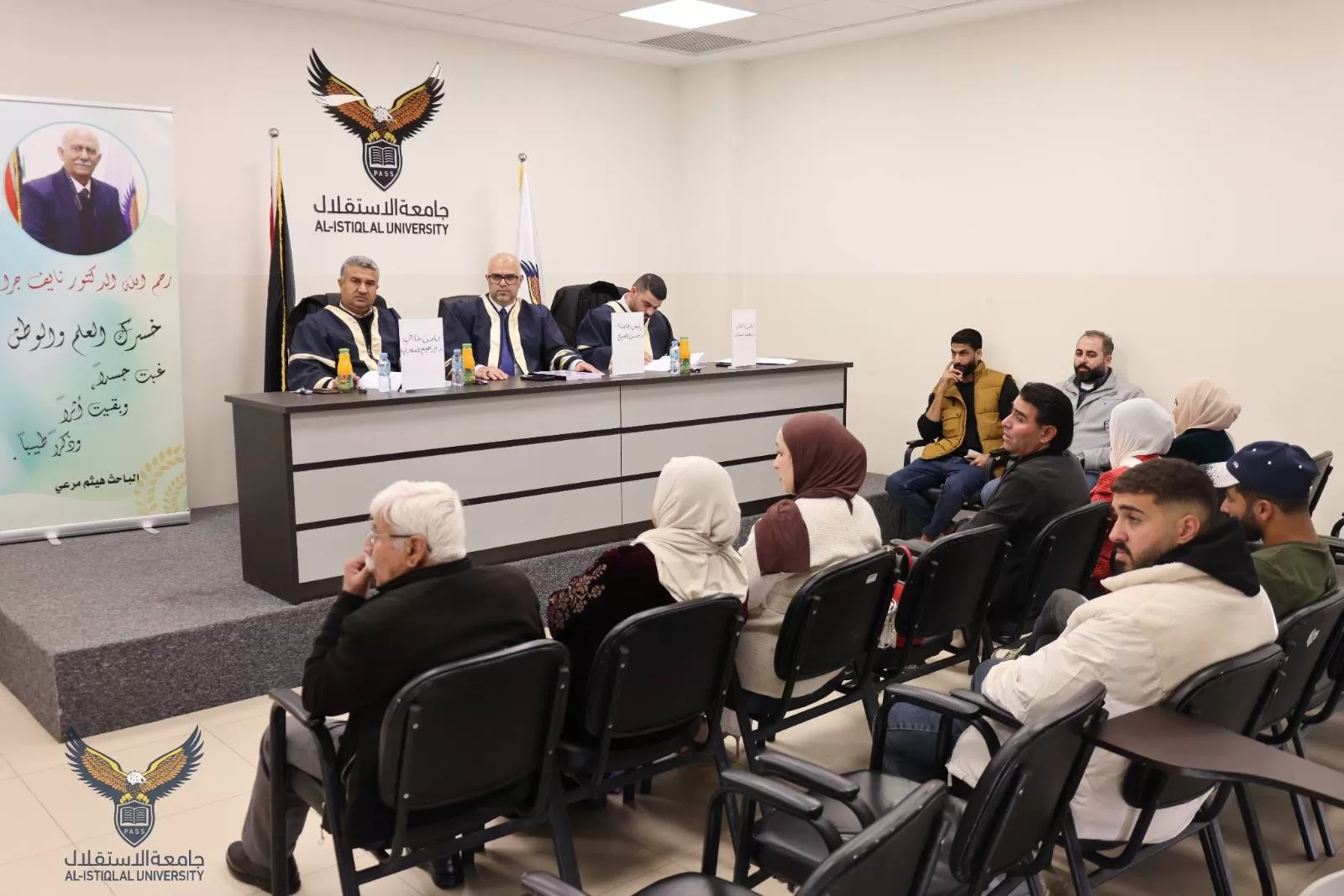 وتكونت لجنة المناقشة من د. حسن الحيح ( مشرفاً)، و د. محمد عساف (ممتحناً داخلياً)، و د. إبرهيم المصري (ممتحناً خارجياً).