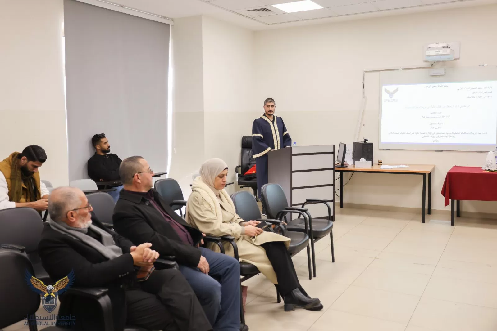 ناقشت كلية الدراسات العليا والبحث العلمي- قسم الإدارة العامة في جامعة الاستقلال رسالة ماجستير تقدّم بها الطالب أحمد عبد الحليم حمارشة الموسومة ب "أثر تطبيق إدارة المخاطر على كفاءة الأداء في وزارة الصحة الفلسطينية".
