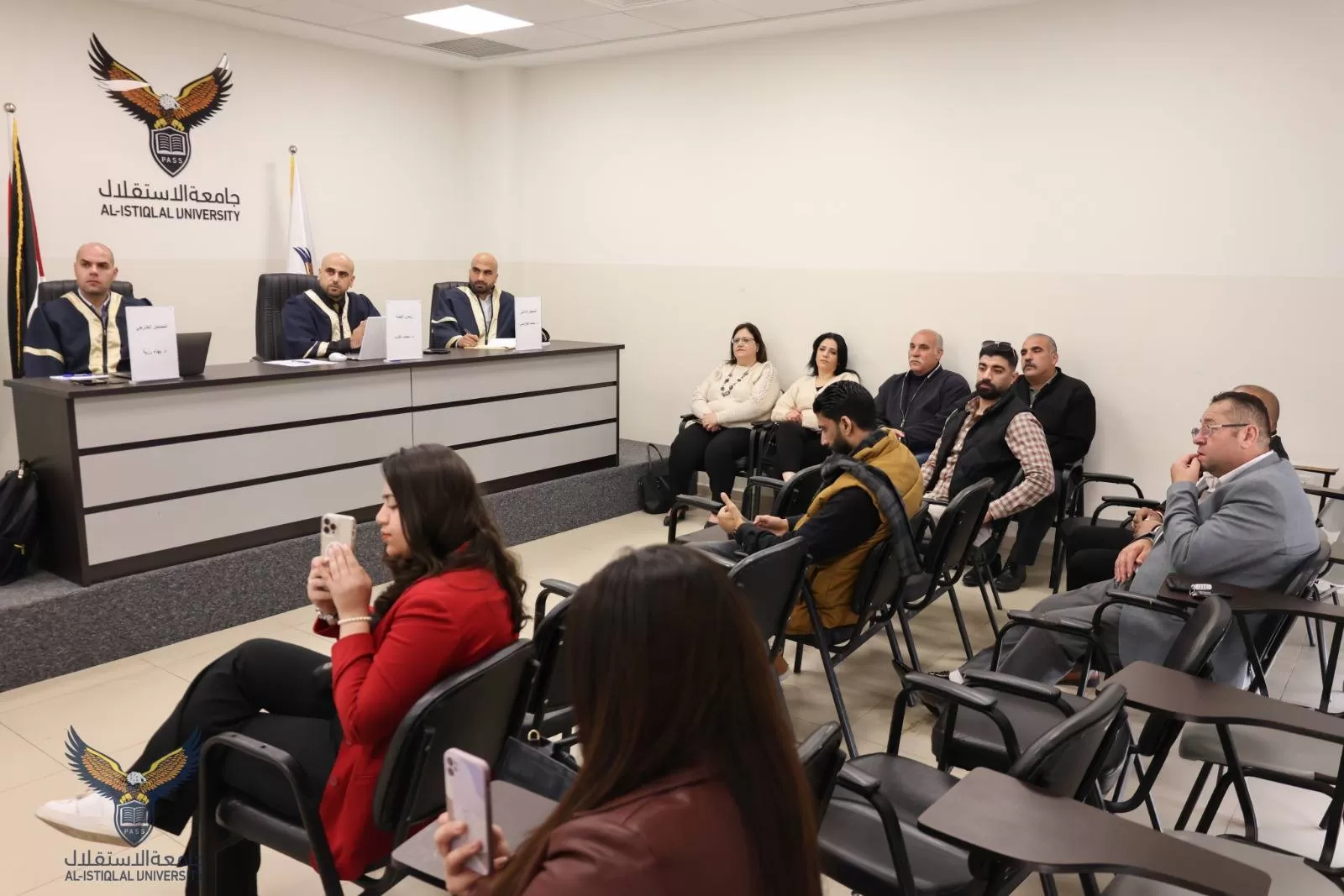 وتكونت لجنة المناقشة من د. محمد الكرم (مشرفاً) و د. محمد القواسمي (ممتحناً داخلياً)، و د. بهاء رزية (ممتحناً خارجياً).