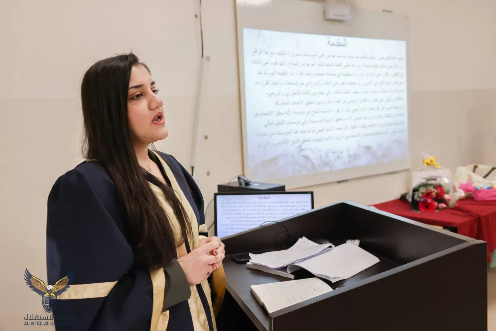 ناقشت كلية الدراسات العليا والبحث العلمي في جامعة الاستقلال اليوم الإثنين رسالة ماجستير للطالبة جوليانا مجروح والموسومة دور القيادة الذكية في تحقيق التراصف الاستراتيجي في مؤسسات التعليم العالي الفلسطيني