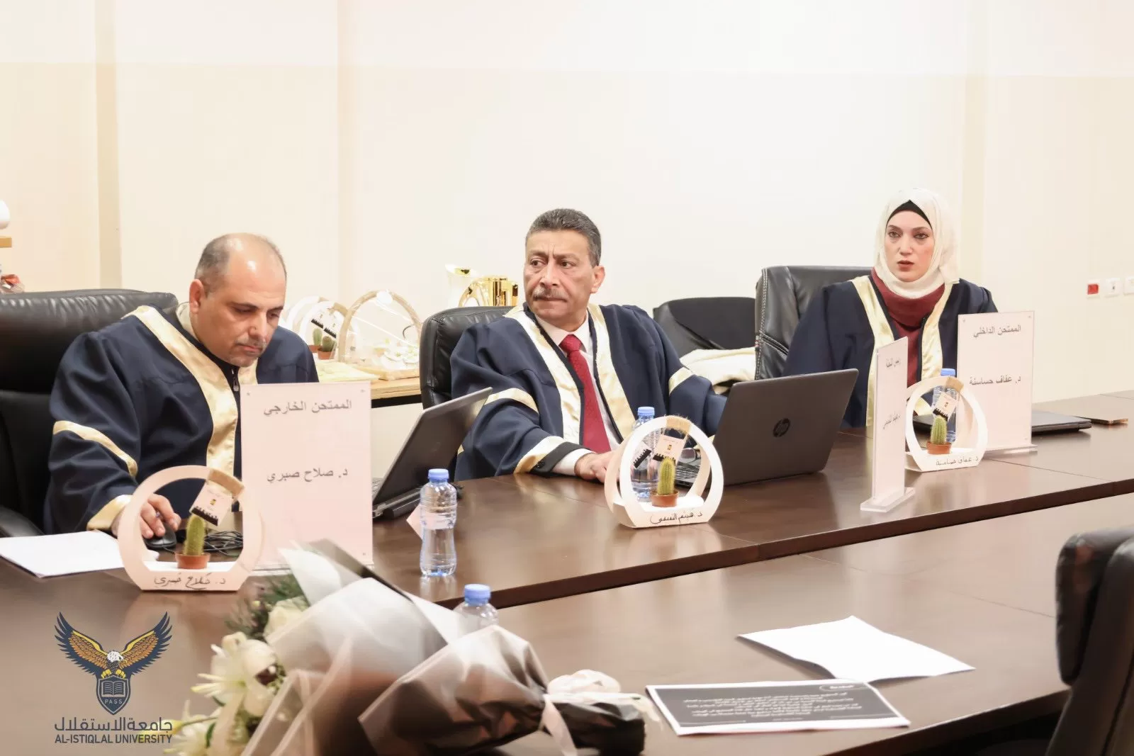 وتكونت لجنة المناقشة من د.هيثم التميمي مشرفًا على الرسالة، د. صلاح صبري ممتحنًا خارجيًا، د. عفاف حساسنة ممتحنًا داخليًا.