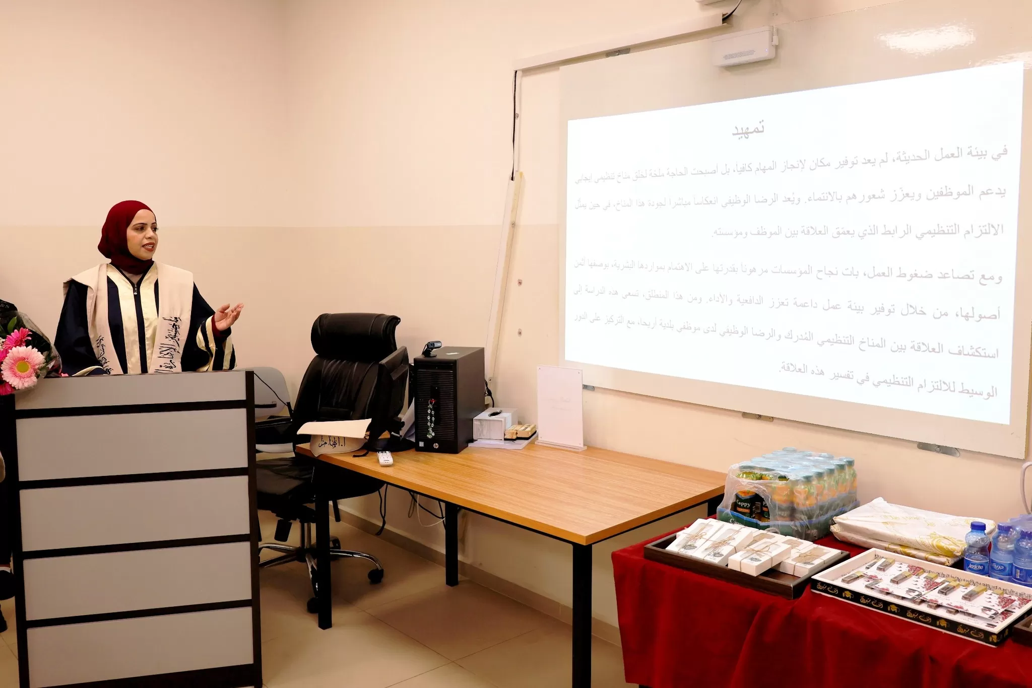 مناقشة رسالة ماجستير حول تأثير المناخ التنظيمي في الرضا الوظيفي: الدور الوسيط للالتزام التنظيمي