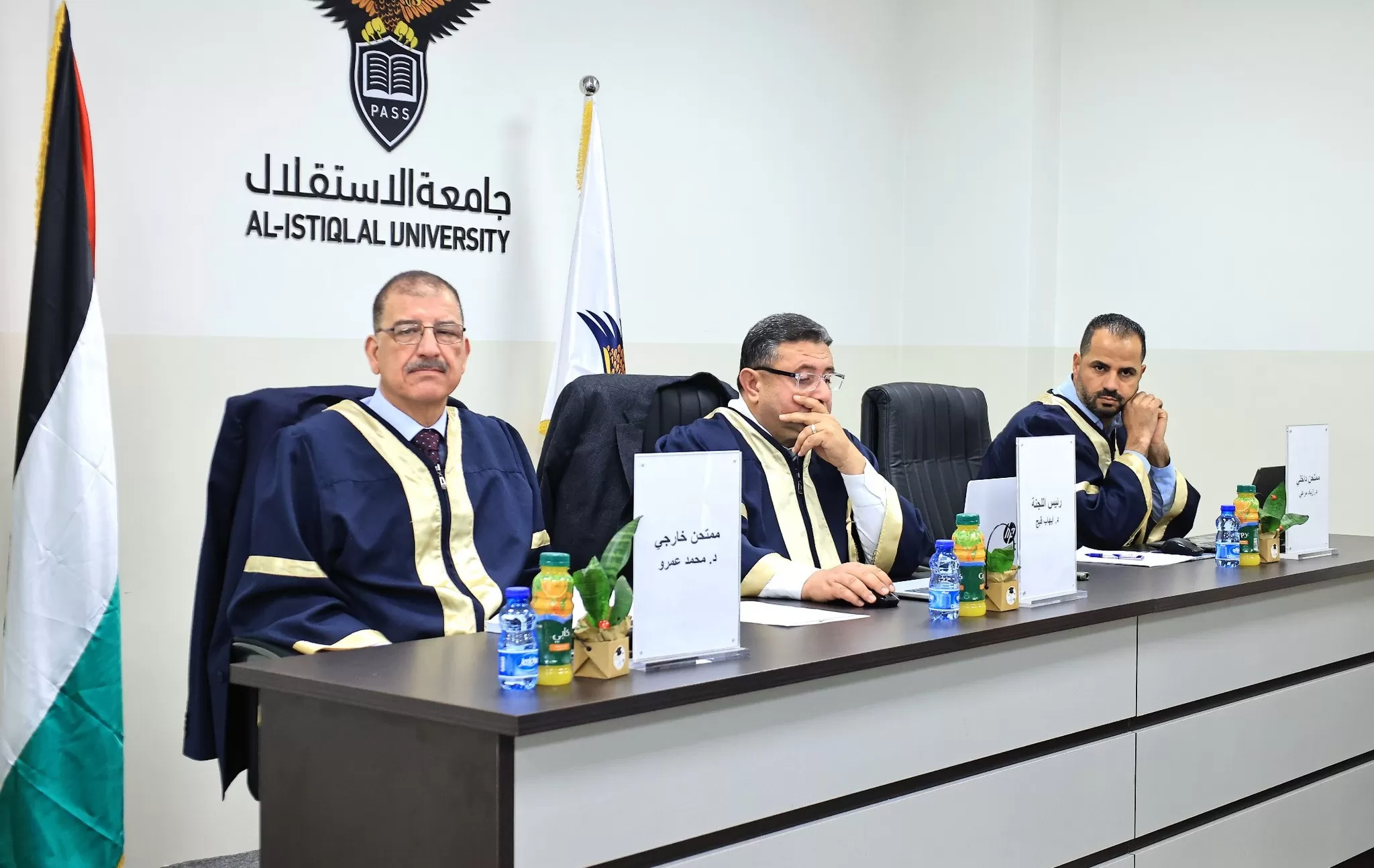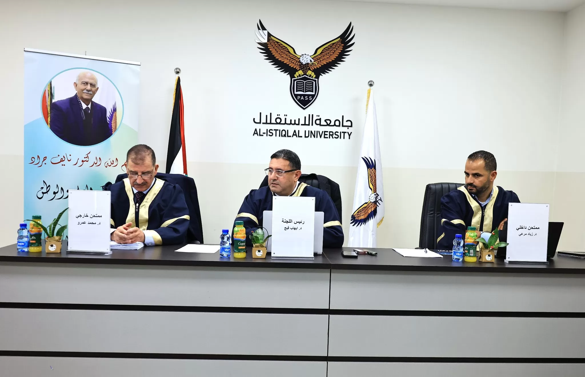 وتكونت لجنة المناقشة من د.إيهاب القبج ( مشرفاً ) ود.زياد مرعي (ممتحناً داخلياً)، و د. محمد عمرو (ممتحناً خارجياً).