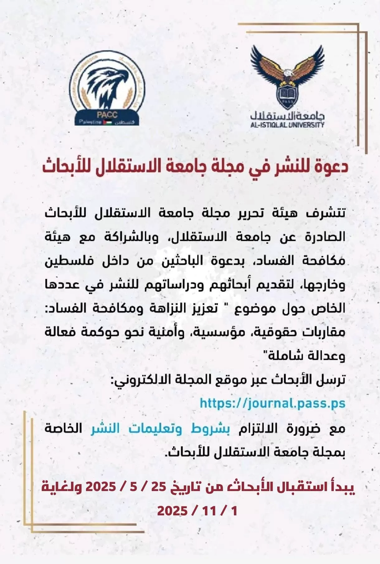 دعوة للنشر في مجلة جامعة الاستقلال للأبحاث