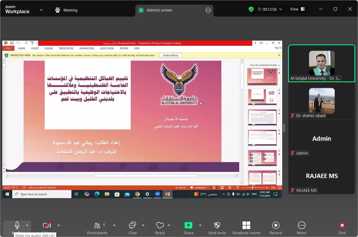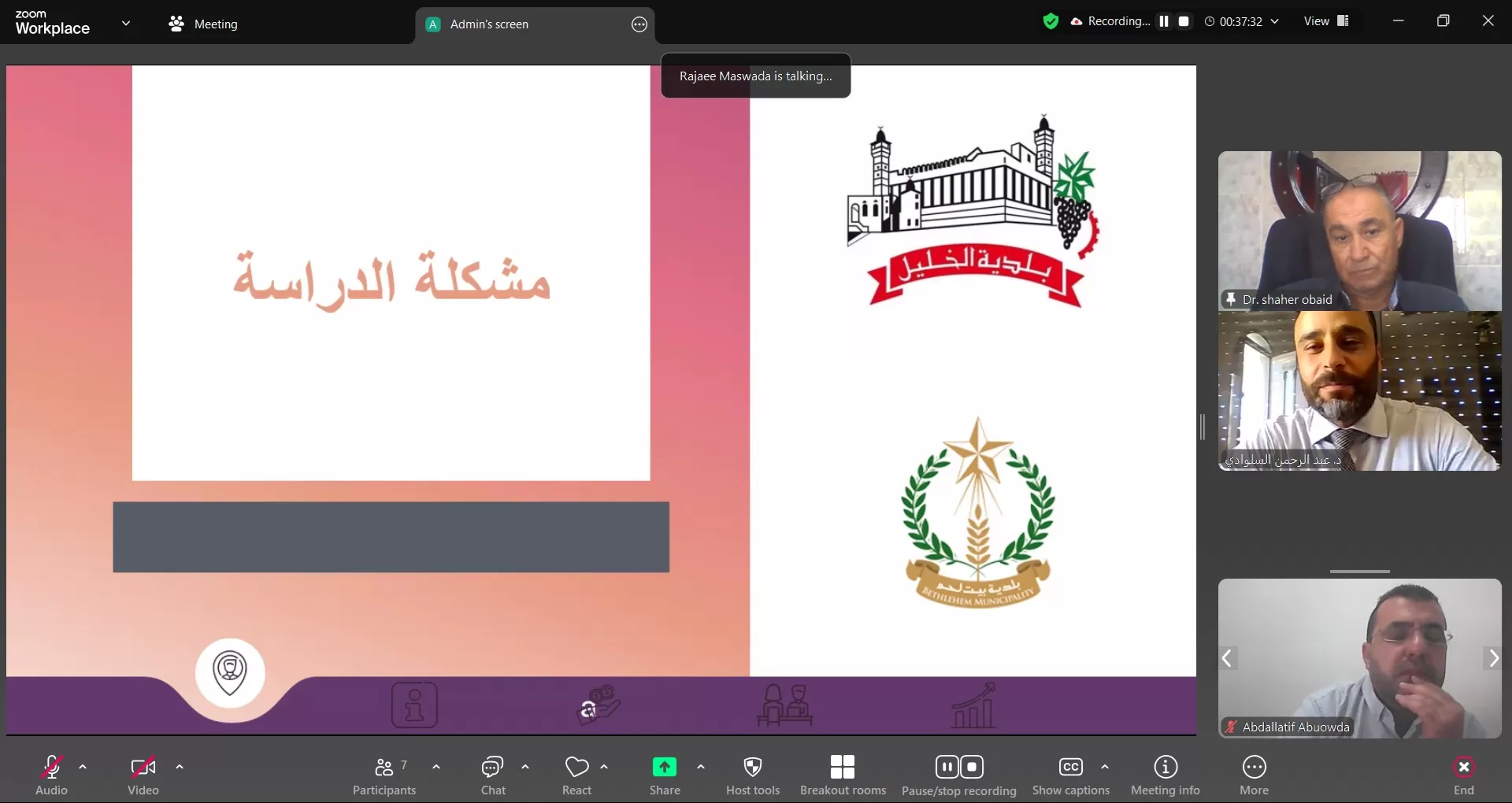 مناقشة رسالة ماجستير حول تقييم الهياكل التنظيمية في المؤسسات العامة الفلسطينية وعلاقتها بالاحتياجات الوظيفية بالتطبيق على بلديتي الخليل وبيت لحم