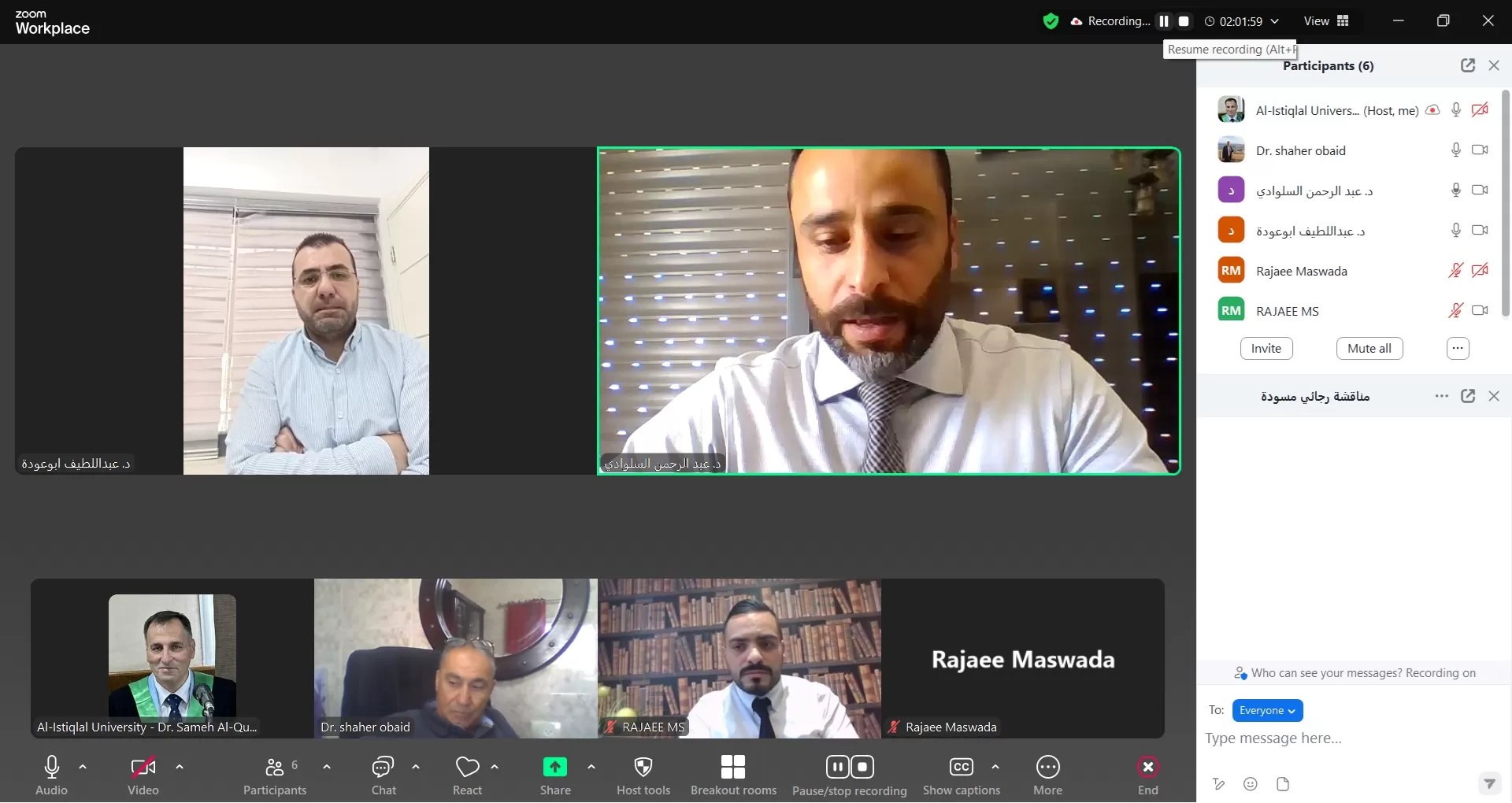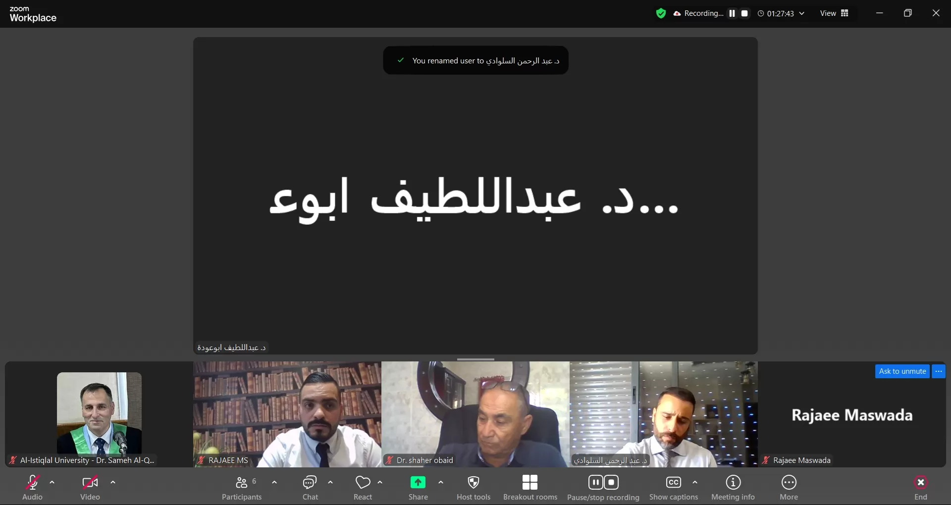 ناقشت كلية الدراسات العليا والبحث العلمي في جامعة الاستقلال اليوم الثلاثاء رسالة ماجستير الكترونياً للطالب رجائي عبد الله مسودة والموسومة " تقييم الهياكل التنظيمية في المؤسسات العامة الفلسطينية وعلاقتها بالاحتياجات الوظيفية بالتطبيق على بلديتي الخليل وبيت لحم".
