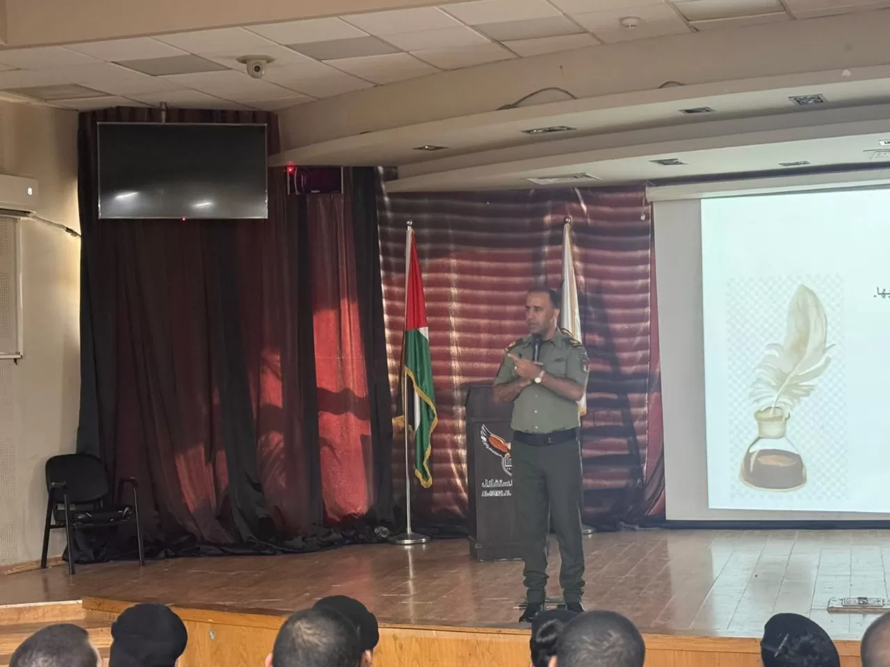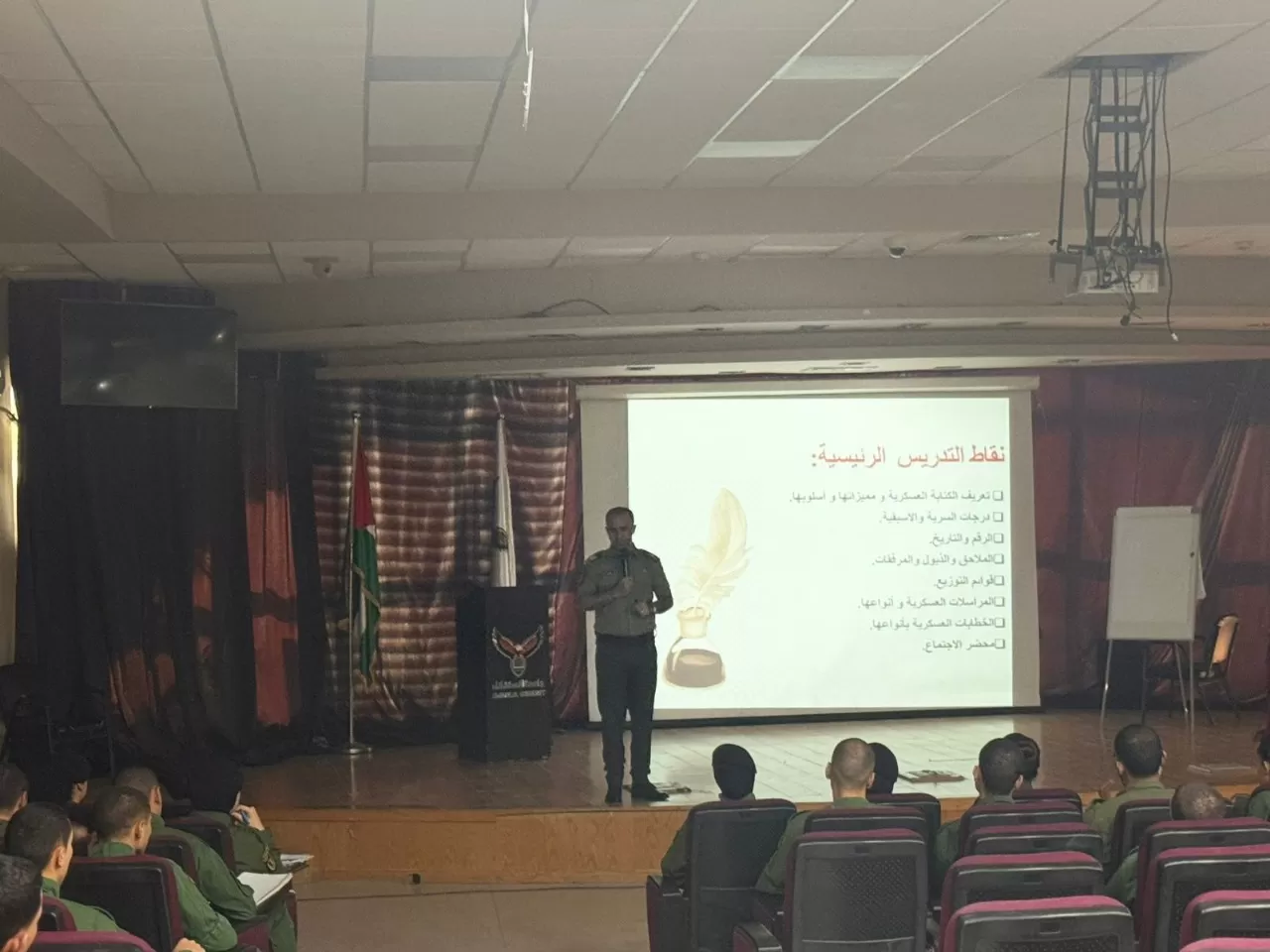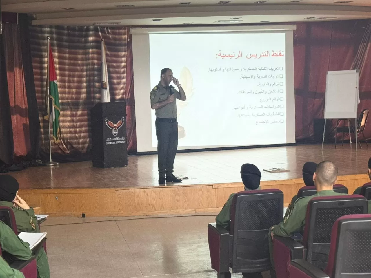ضمن سلسلة المحاضرات المركزية التي ينظمها برنامج القيادة في جامعة الاستقلال، والتي تهدف إلى تعزيز الكفاءة المعرفية والمهارية لدى الطلبة، قدم الرائد خليل جابر، من هيئة التدريب العسكري لقوى الأمن الفلسطينية، محاضرة نوعية ومميزة في أصول الكتابة العسكرية، والتي استهدفت طلبة السنة الثالثة.