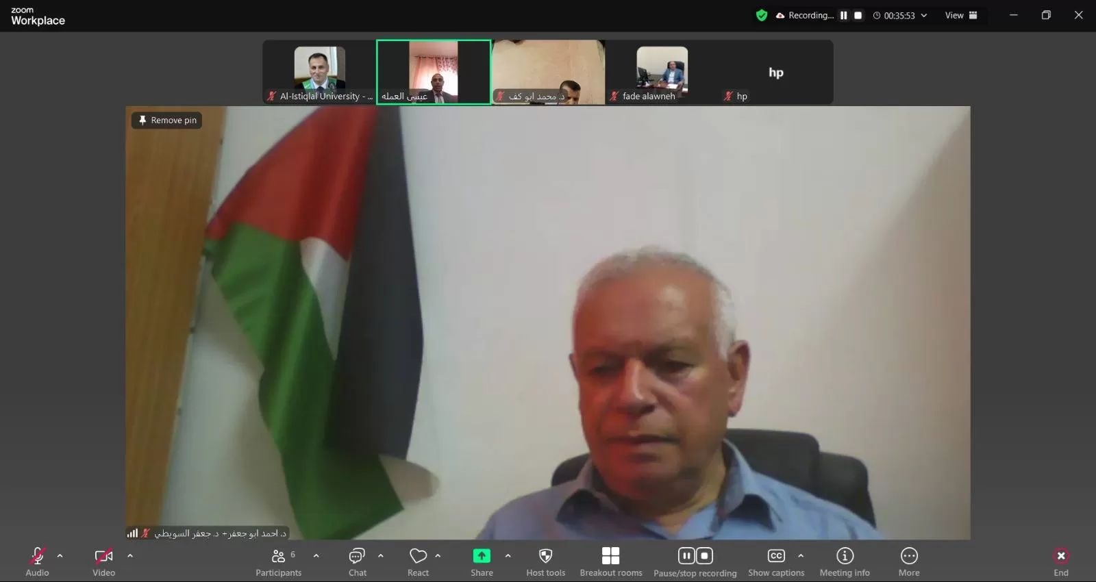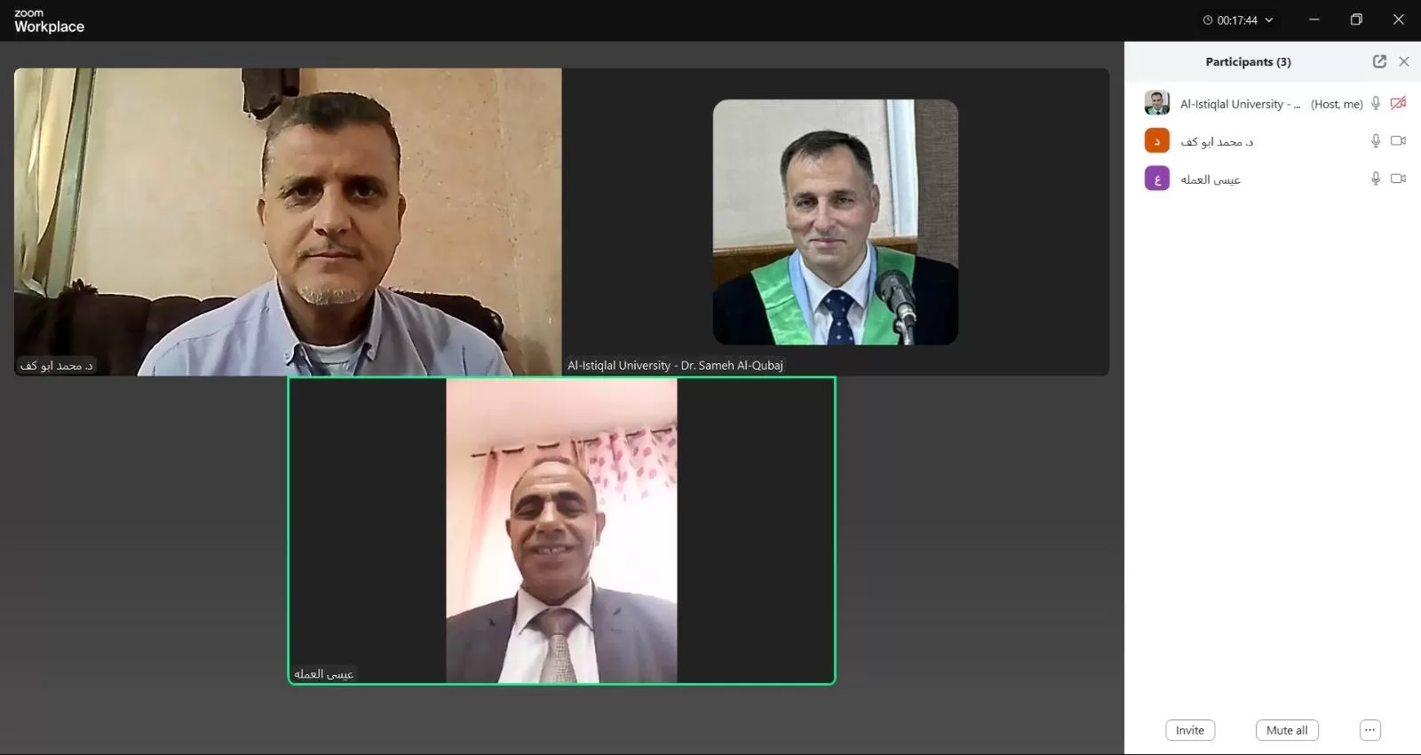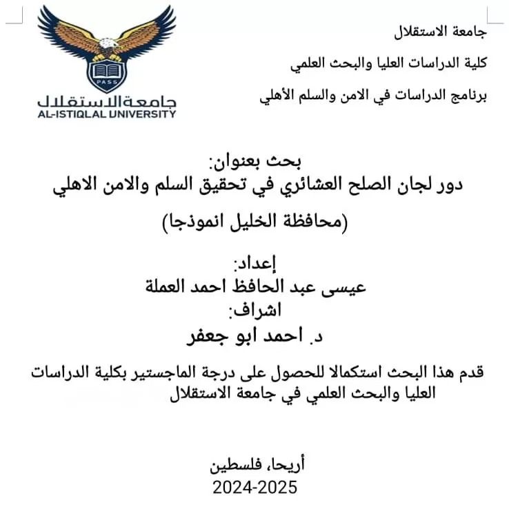 ناقشت كلية الدراسات العليا والبحث العلمي في جامعة الاستقلال اليوم الأربعاء رسالة ماجستير الكترونياً للطالب عيسى عبد الحافظ أحمد العملة والموسومة "دور لجان الصلح العشائري في تحقيق السلم والامن الاهلي محافظة الخليل أنموذجاً".