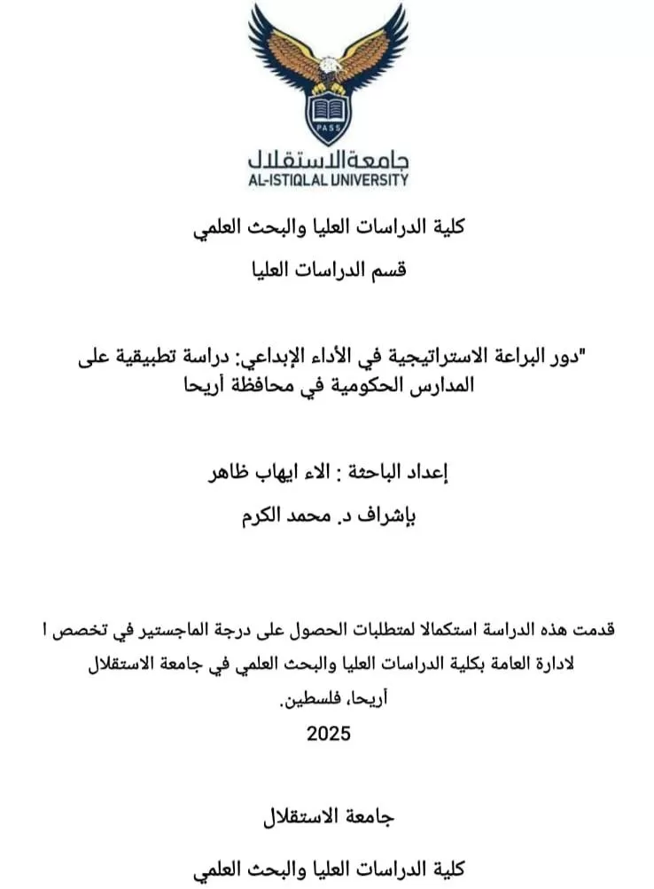 مناقشة رسالة ماجستير حول دور البراعة الاستراتيجية في الأداء الإبداعي: دراسة تطبيقية على المدارس الحكومية في محافظة أريحا