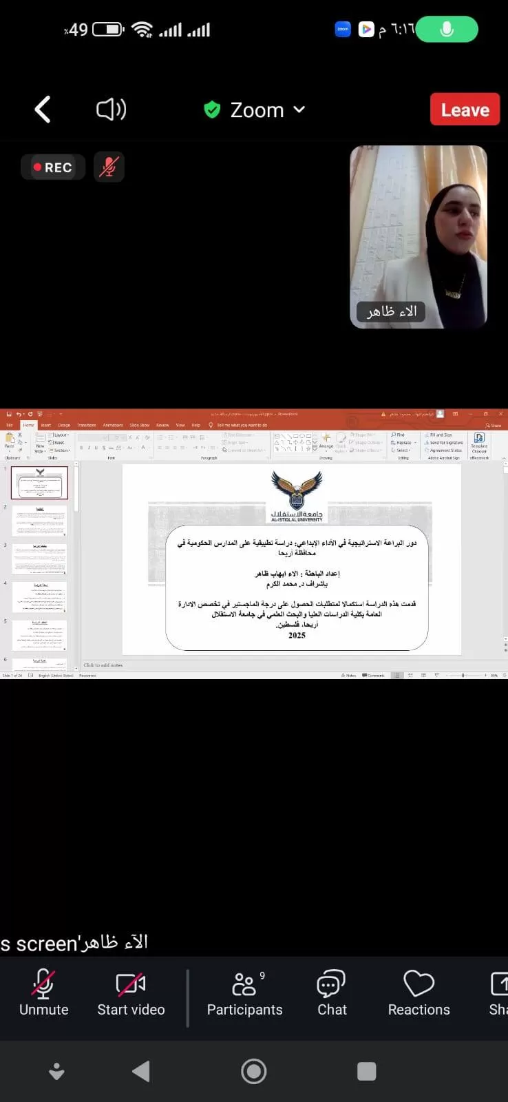 ناقشت كلية الدراسات العليا والبحث العلمي في جامعة الاستقلال اليوم الإثنين رسالة ماجستير الكترونياً للطالبة الاء إيهاب ظاهر والموسومة "دور البراعة الاستراتيجية في الأداء الإبداعي: دراسة تطبيقية على المدارس الحكومية في محافظة أريحا