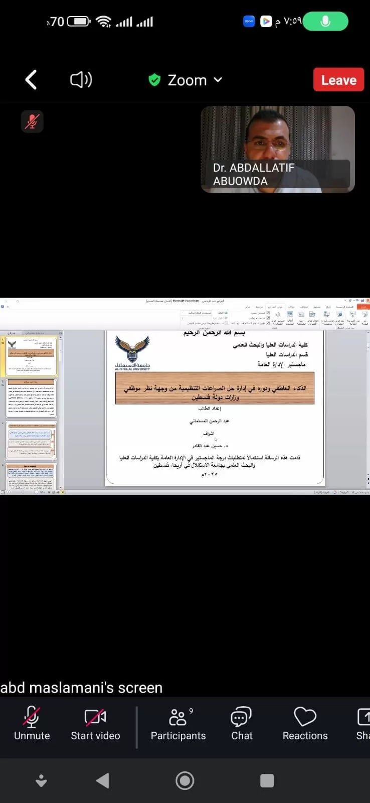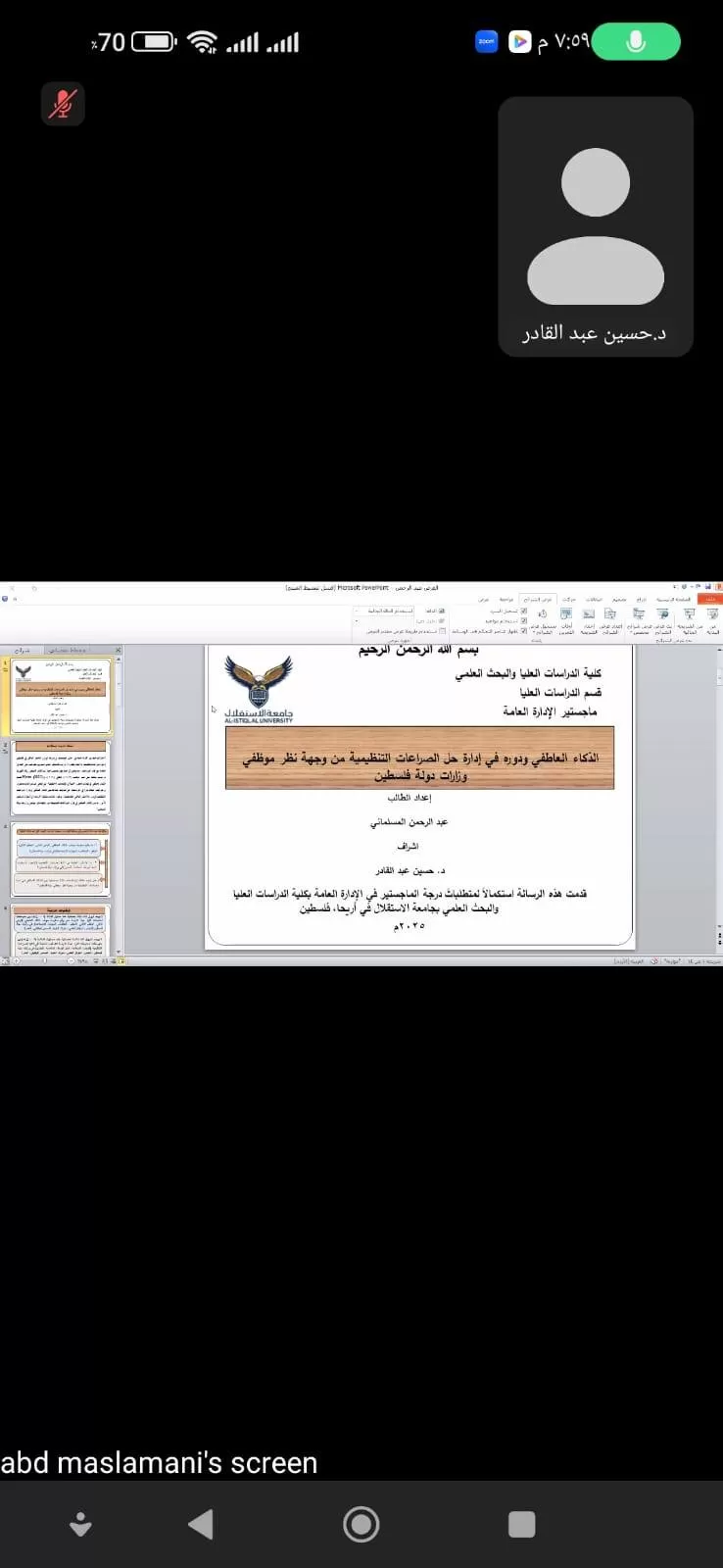 مناقشة رسالة ماجستير حول الذكاء العاطفي ودوره في إدارة حل الصراعات التنظيمية من وجهة نظر موظفي وزارات دولة فلسطين