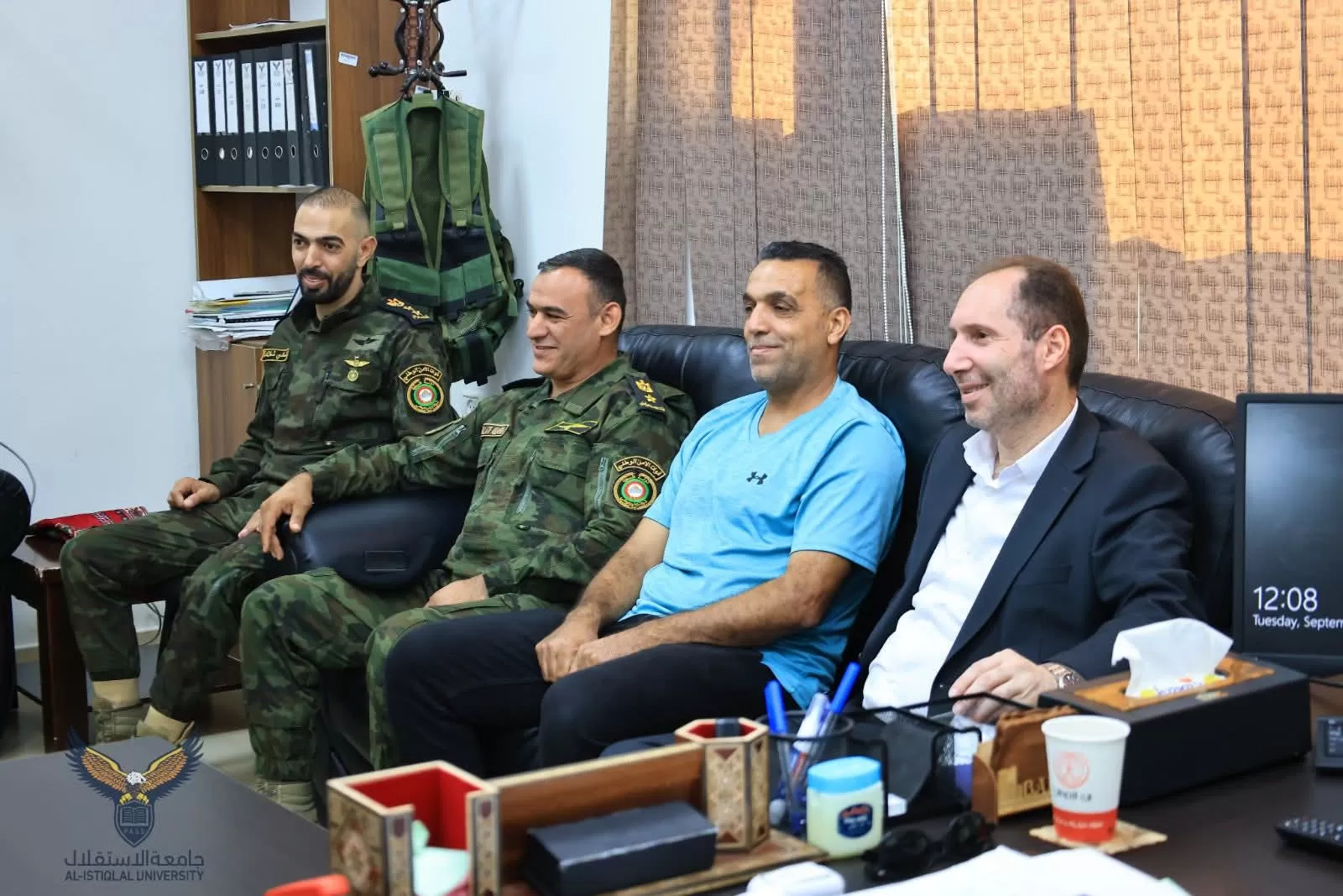 من جانبه، عبّر العقيد بركات عن سعادته بهذا اللقاء وحفاوة الاستقبال، مشيداً بالدور الريادي لجامعة الاستقلال في إعداد وتأهيل الكوادر العسكرية والأمنية، ودعمها المتواصل للمبادرات الرياضية الوطنية. وأكد أهمية توحيد الجهود لرفع مستوى الرياضات وتطوير قطاع الرياضة العسكرية من خلال تنظيم بطولات وبرامج تدريبية مشتركة، بما يسهم في صقل مهارات الأجيال الشابة. كما شدّد على ضرورة تكثيف المشاركة في الفعاليات المحلية والدولية، لما تحمله من قيمة في إبراز وترسيخ الهوية الفلسطينية وإظهار صورة حضارية وسيادية عن فلسطين أمام العالم، رغم ما يواجهه أبناء شعبنا من تحديات وصعاب، وتوجيه رسالة من أرض الصمود بأننا قادرون على النجاح والتميز في مختلف الميادين.