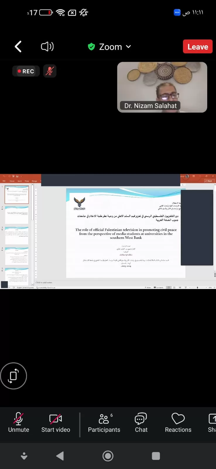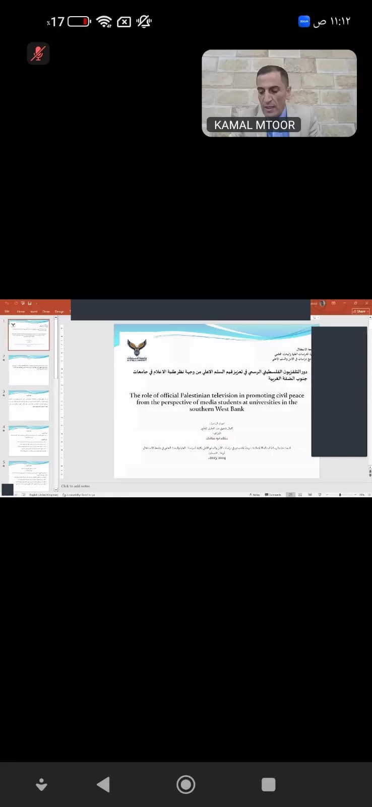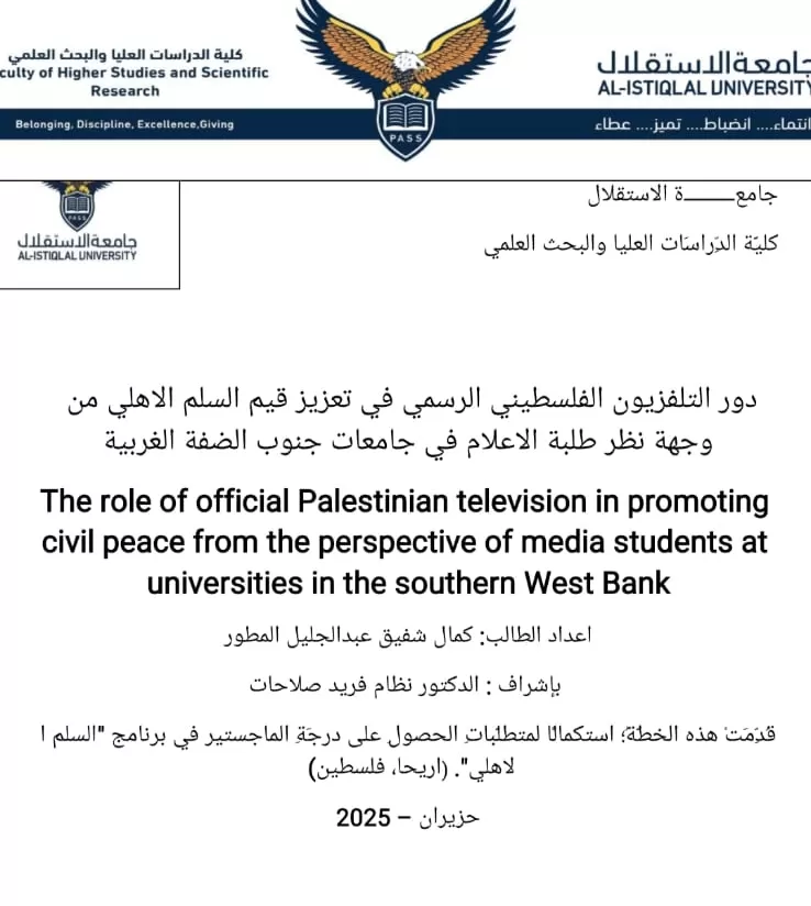 مناقشة رسالة ماجستير حول دور تلفزيون فلسطين الرسمي في تعزيز قيم السلم الاهلي من وجهة نظر طلبة الاعلام في جامعات جنوب الضفة الغربية