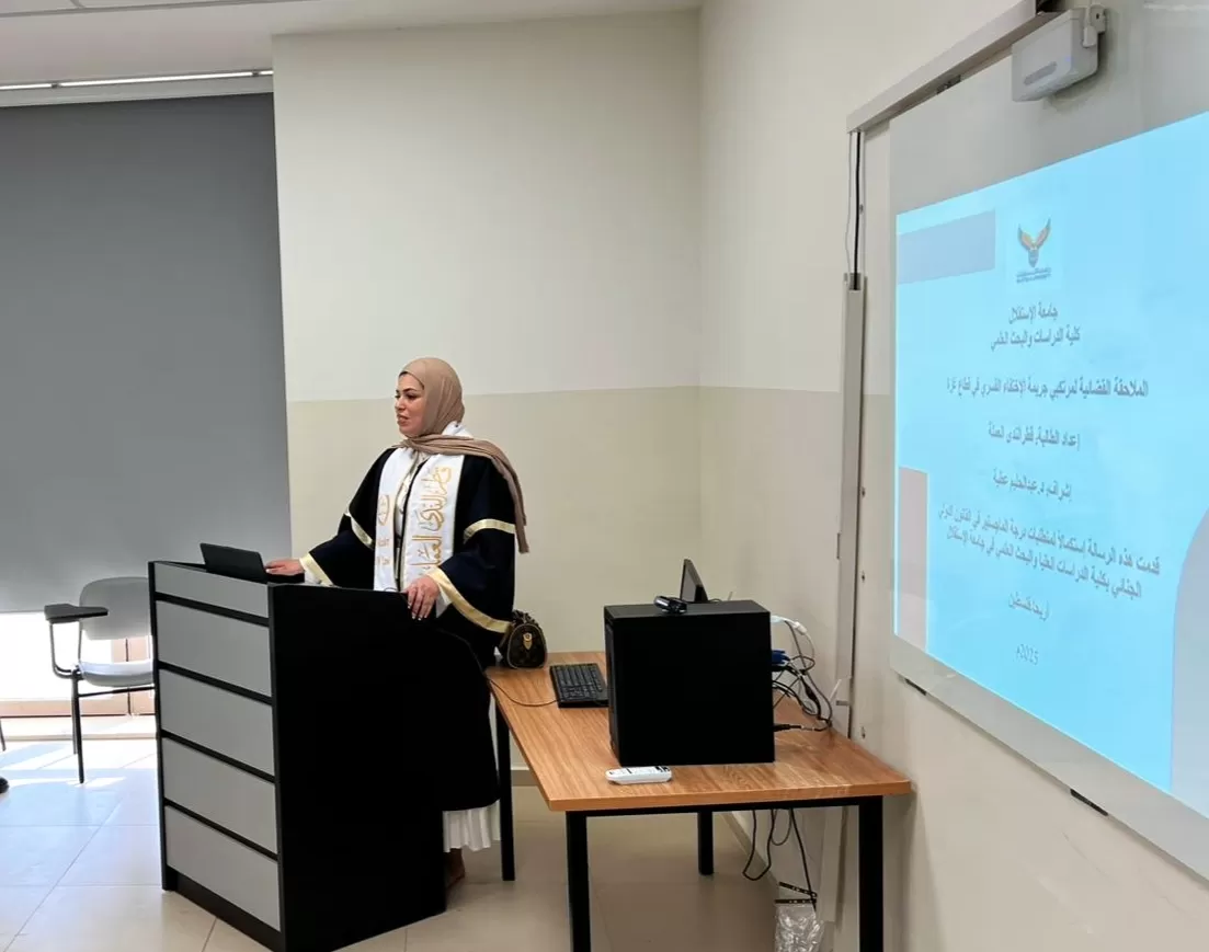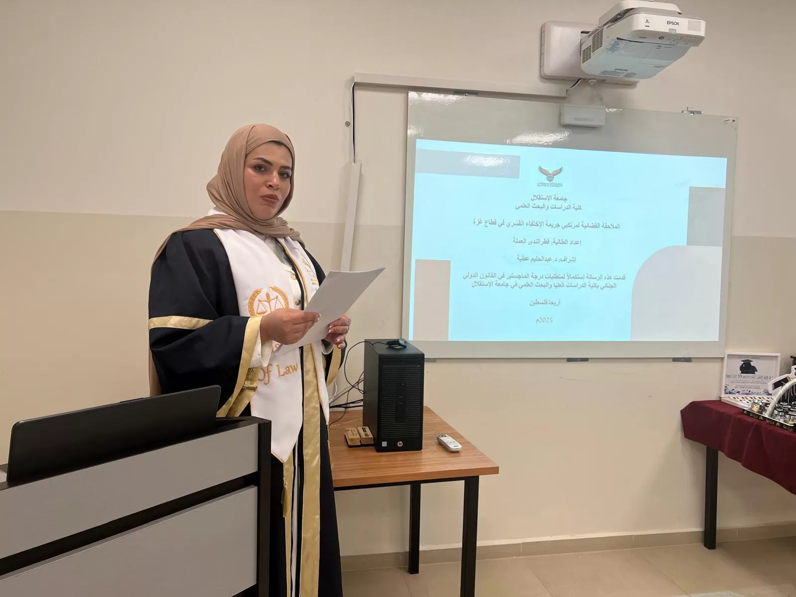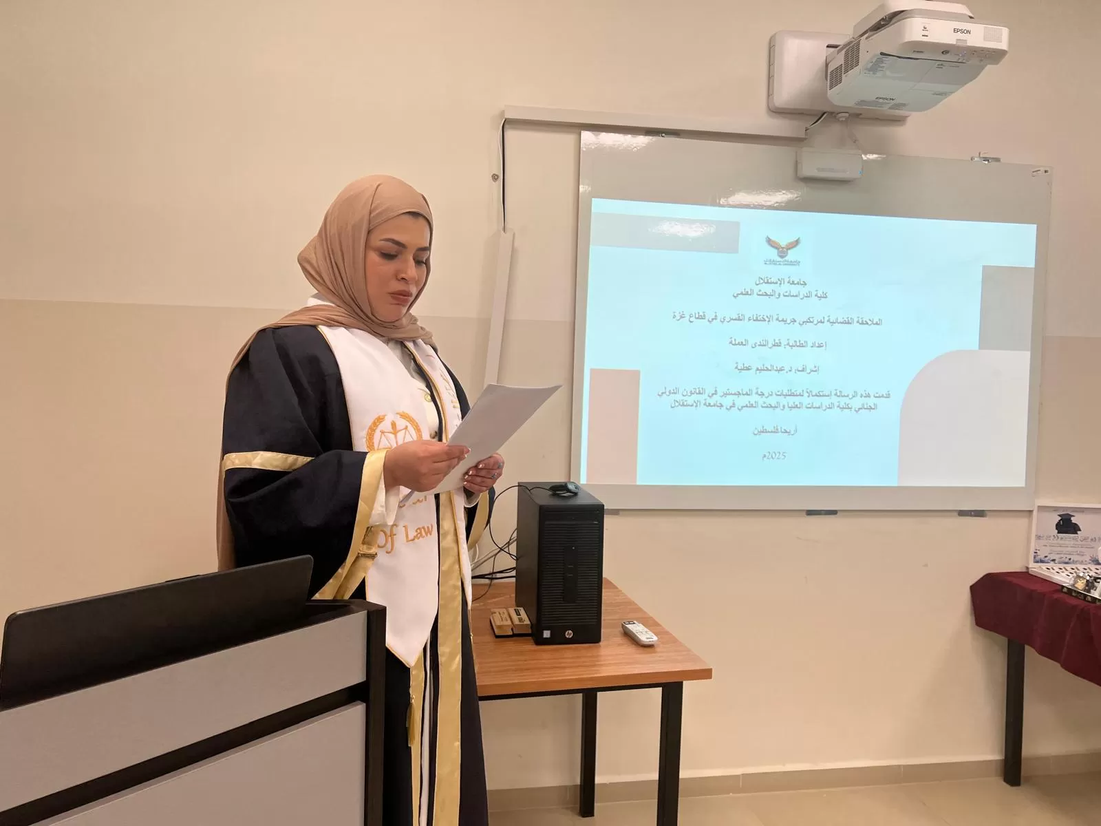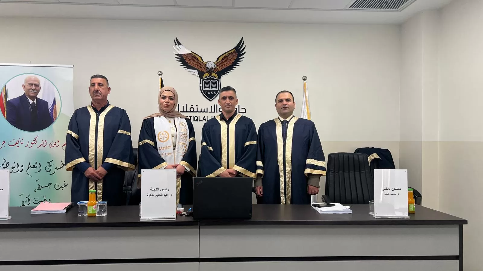 ناقشت كلية الدراسات العليا والبحث العلمي في جامعة الاستقلال اليوم الإثنين رسالة ماجستير للطالبة قطرالندى نهاد العملة والموسومة “الملاحقة القضائية لمرتكبي جريمة الإختفاء القسري في قطاع غزة”