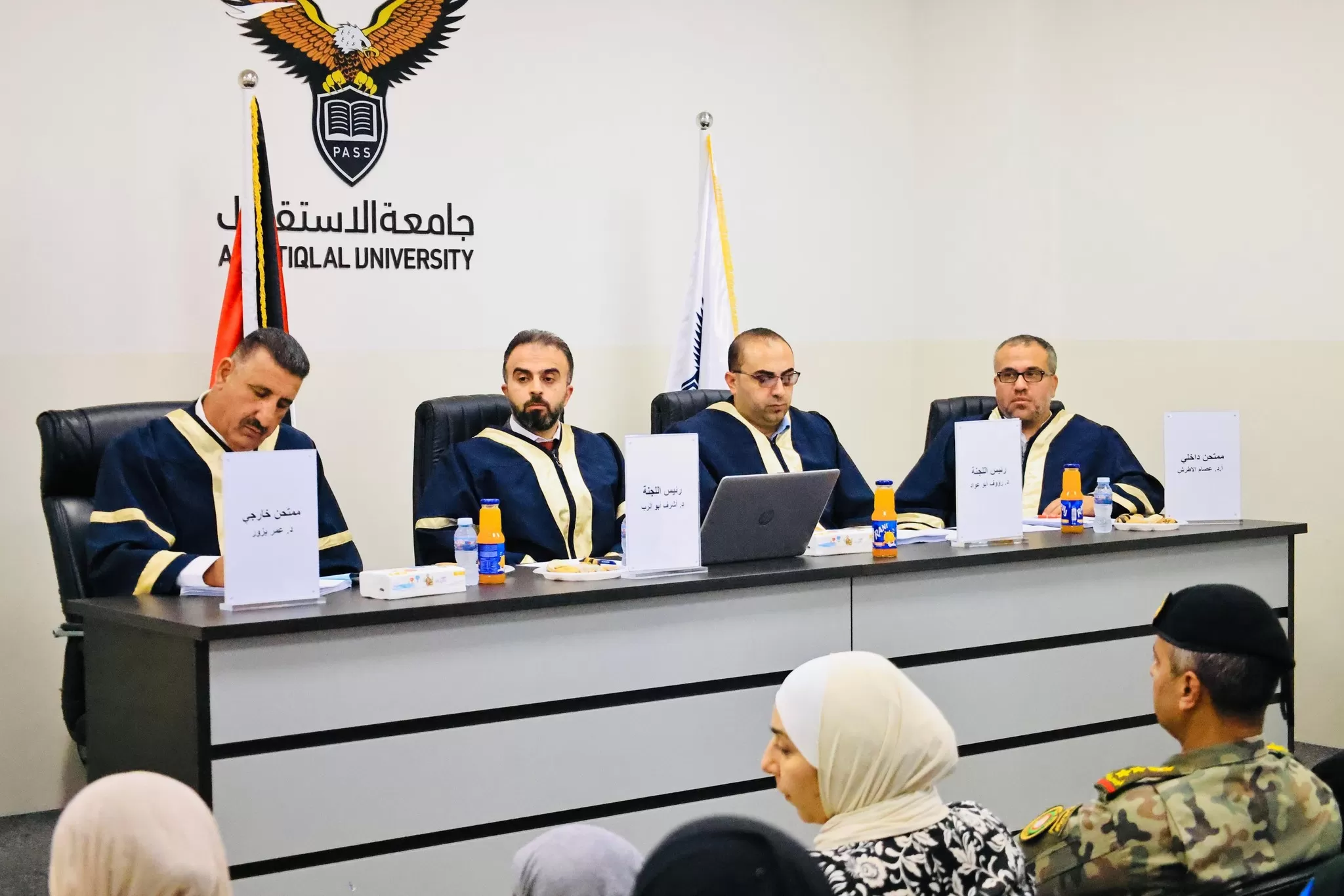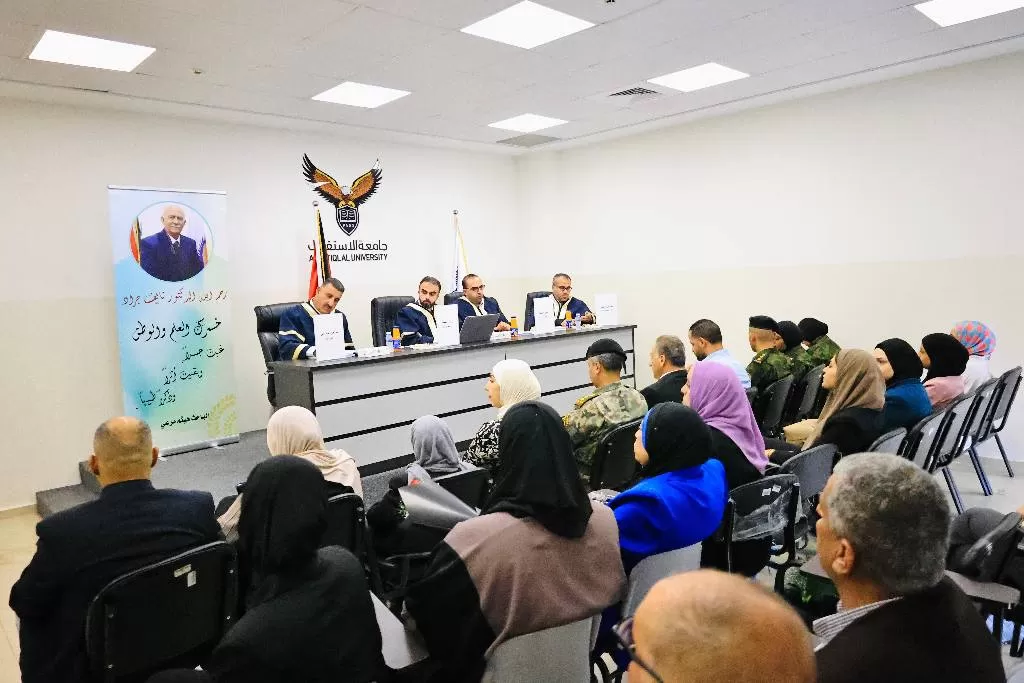 وتكونت لجنة المناقشة من د.أشرف أبو الرب ( مشرفاً) ، و د. رؤوف أبو عواد (مشرفاً )، وأ.د عصام الأطرش (ممتحناً داخلياً)، و د. عمر بزور (ممتحناً خارجياً).