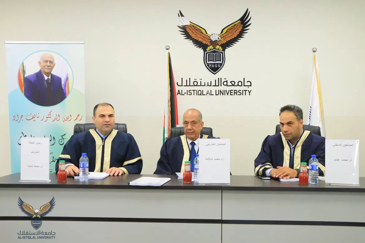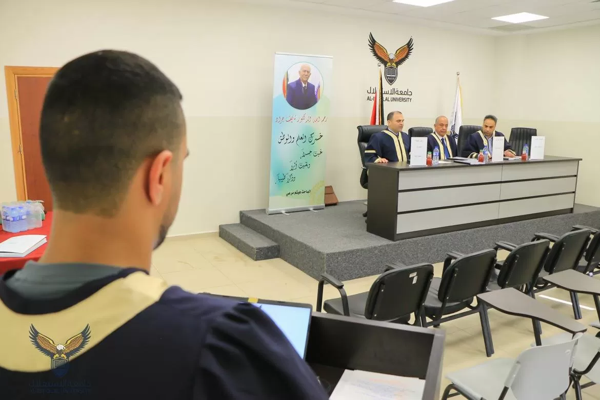 ناقشت كلية الدراسات العليا والبحث العلمي في جامعة الاستقلال اليوم الأربعاء رسالة ماجستير للطالب عبيدة نمورة والموسومة الاعتداءات على الممتلكات الخاصة أثناء النزاعات المسلحة الحرب على قطاع غزة عام 2023 أنموذجاً.