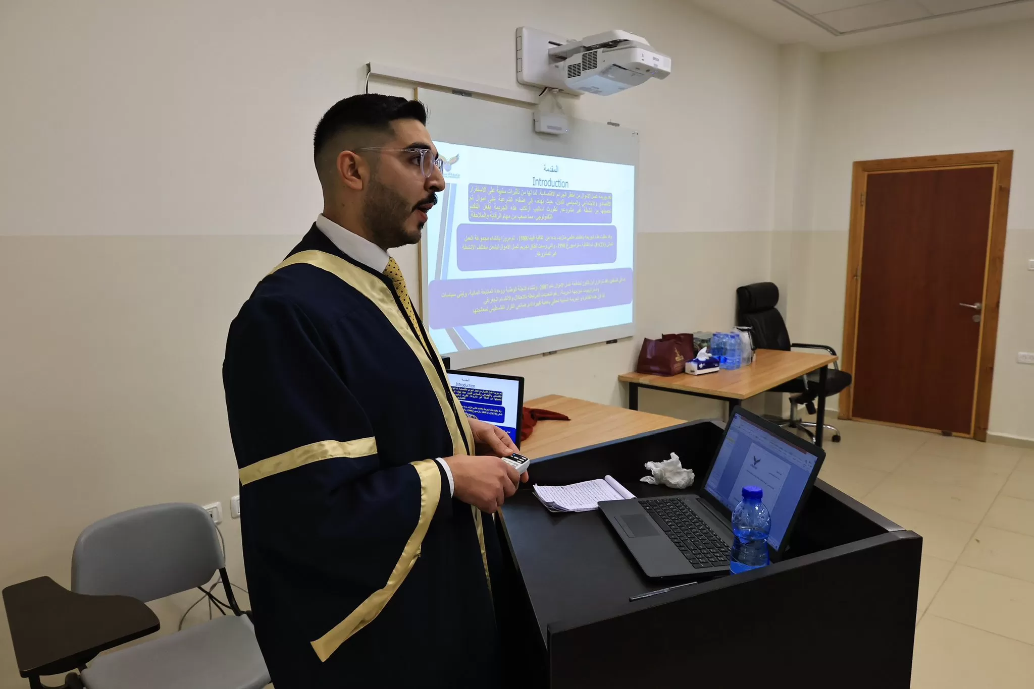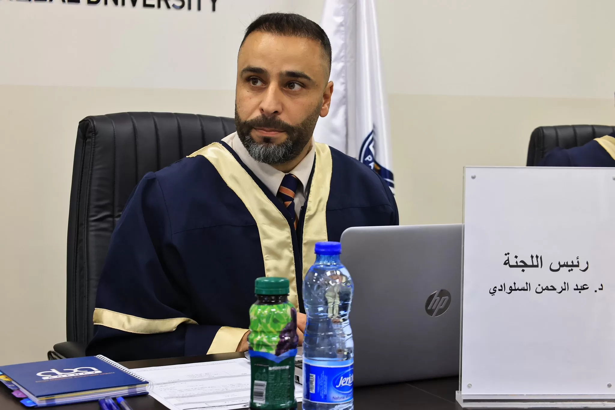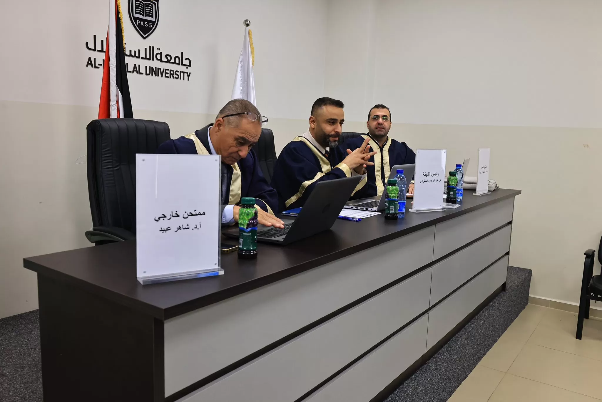 وتكونت لجنة المناقشة من د.عبد الرحمن سلوادي مشرفًا على الرسالة، د. عبّد اللطيف أبو عودة ممتحنًا داخليًا، أ.د. شاهر عبيد ممتحنًا خارجيًا.