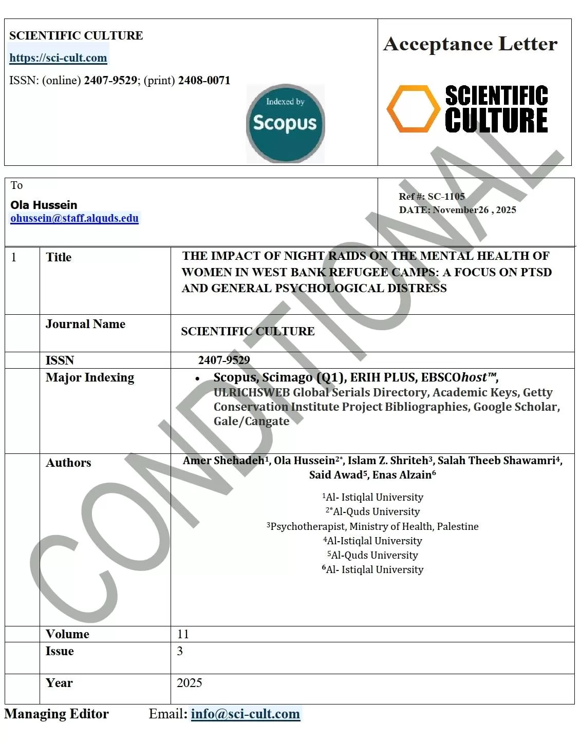 في إنجاز أكاديمي جديد يعكس صعود الجامعة في مؤشرات البحث العلمي المتخصص، أعلنت جامعة الاستقلال كلية العلوم الانسانية - قسم علم النفس عن نشر دراسة نوعية متقدمة في قاعدة بيانات Scopus – Q1 عبر مجلة Scientific Culture، وذلك ضمن مسار بحثي يركز على قضايا المرأة الفلسطينية في بيئات الضغط العالي، خصوصاً داخل مخيمات اللاجئين تحت عنوان (التأثيرات النفسية للمداهمات الليلية على النساء في مخيمات اللاجئين بالضفة الغربية) التركيز على اضطراب ما بعد الصدمة والصحة النفسية العامة.