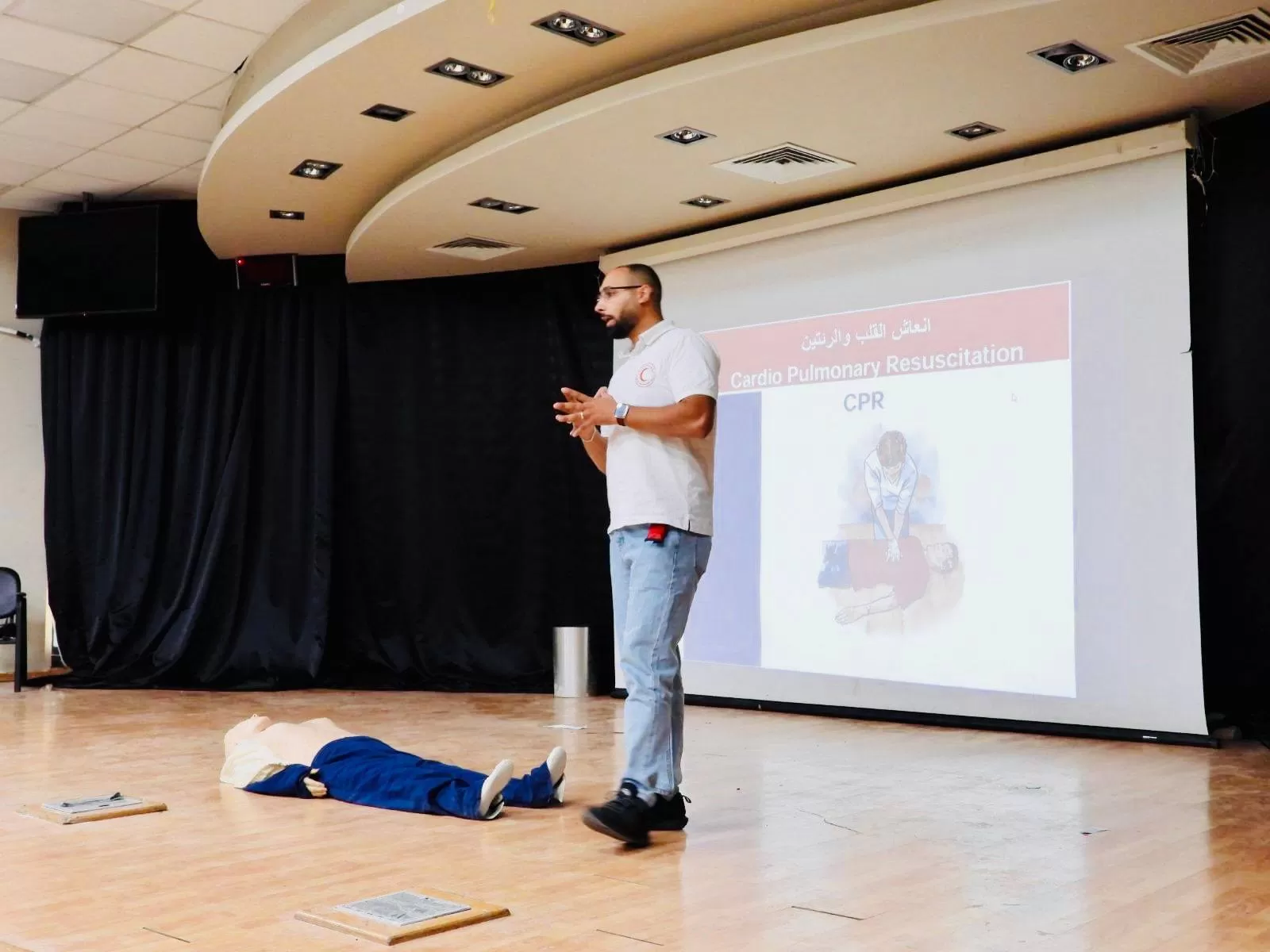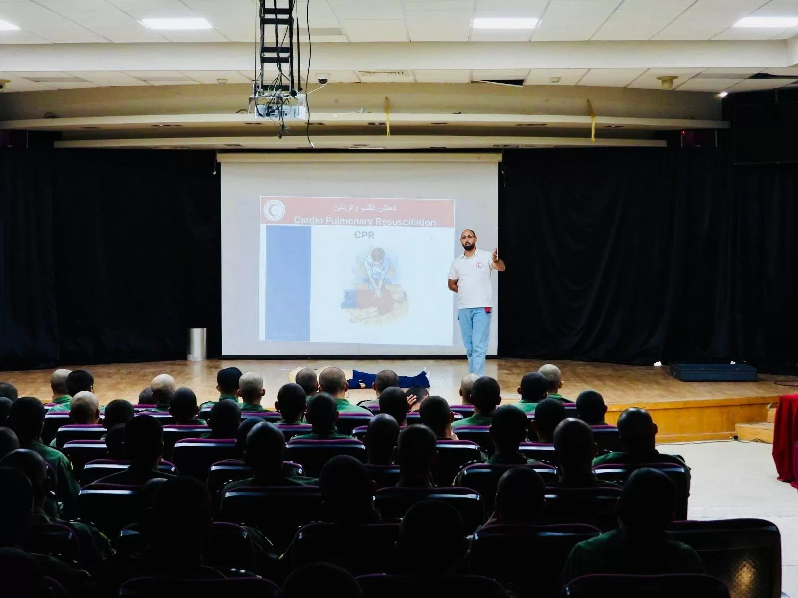 كما تم عرض أدوات الإسعاف الأولي، وقد تم محاكاة لجسم مصاب وتدريب الطلبة على عملية الإنعاش والاصابات التي قد يتعرض لها الأفراد، لضمان اكتساب المهارات بفاعلية، وشهدت المحاضرة تفاعلاً كبيراً من الطلبة.