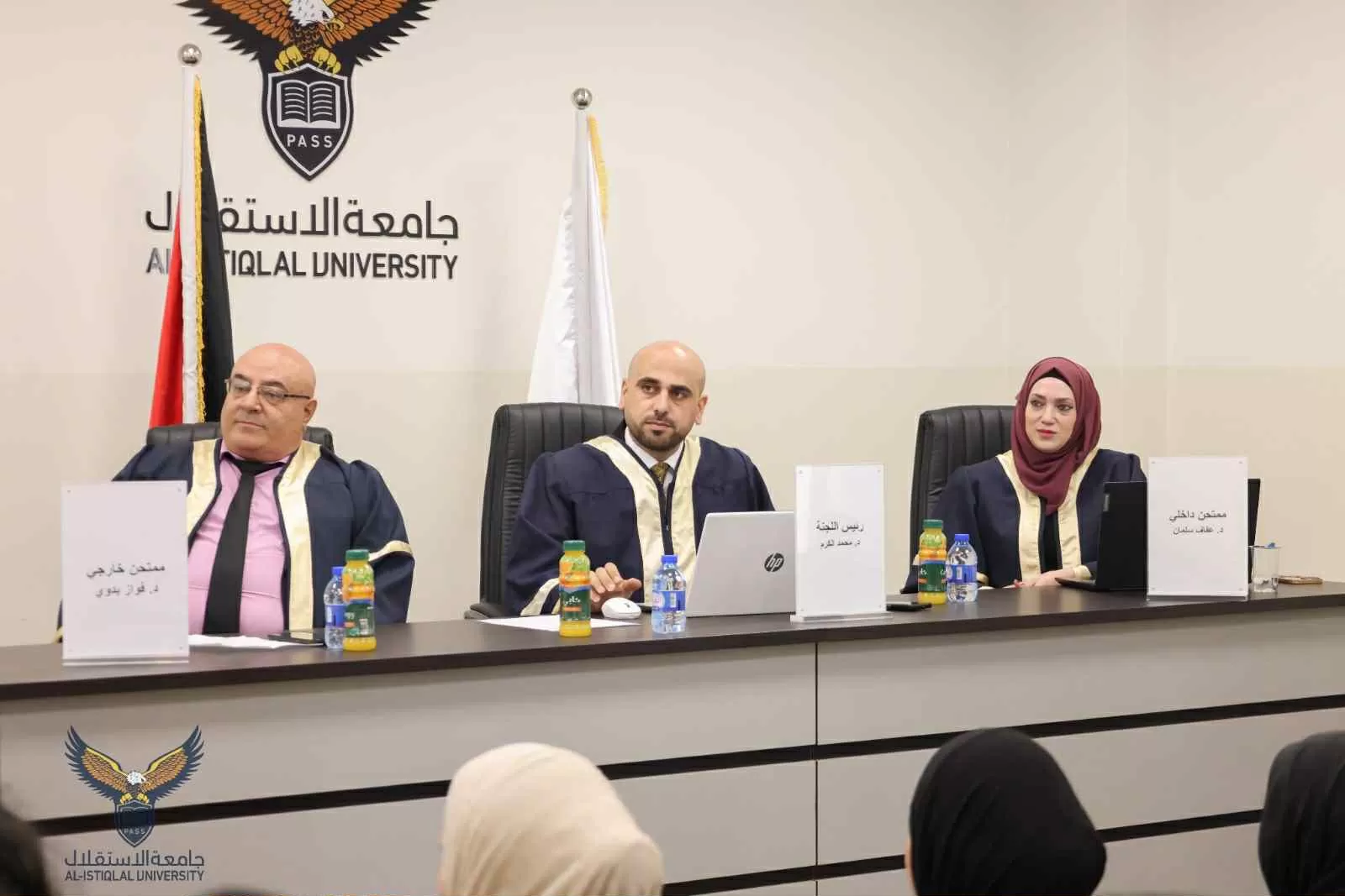 وتكونت لجنة المناقشة من د. محمد القرم مشرفًا على الرسالة، د. فواز البدوي ممتحنًا خارجيًا، د.عفاف حساسنة ممتحنًا داخليًا.