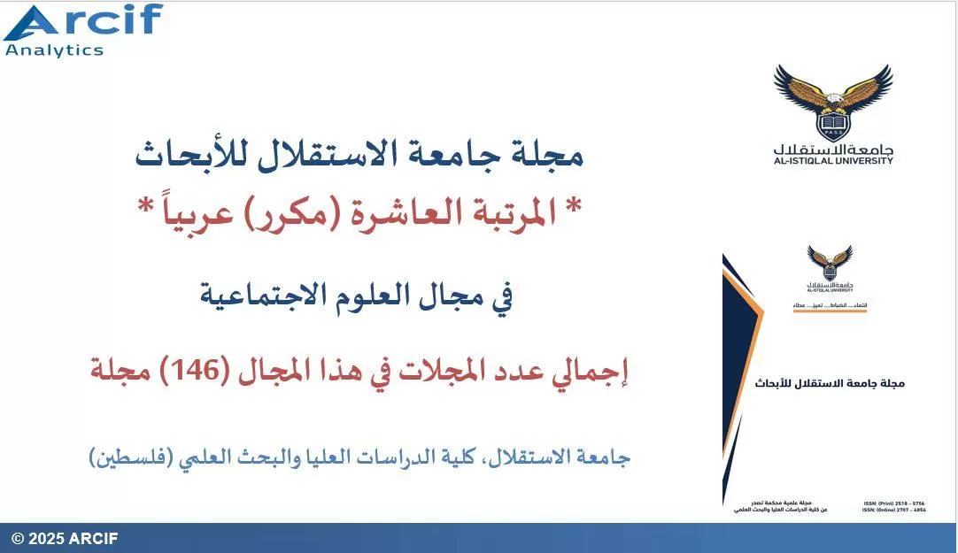 في انجاز أكاديمي نوعي يعكس مكانة جامعة الاستقلال المتقدمة في مجال البحث العلمي، حصدت مجلة جامعة الاستقلال للأبحاث، وهي مجلة علمية محكمة، المرتبة العاشرة عربياً ضمن فئة المجلات العلمية متعددة التخصصات في محور العلوم الاجتماعية، وذلك وفقاً لمعامل التأثير العربي أرسيف ARCIF، أحد أهم المؤشرات المعتمدة في تقييم جودة المجلات الأكاديمية على مستوى الوطن العربي.