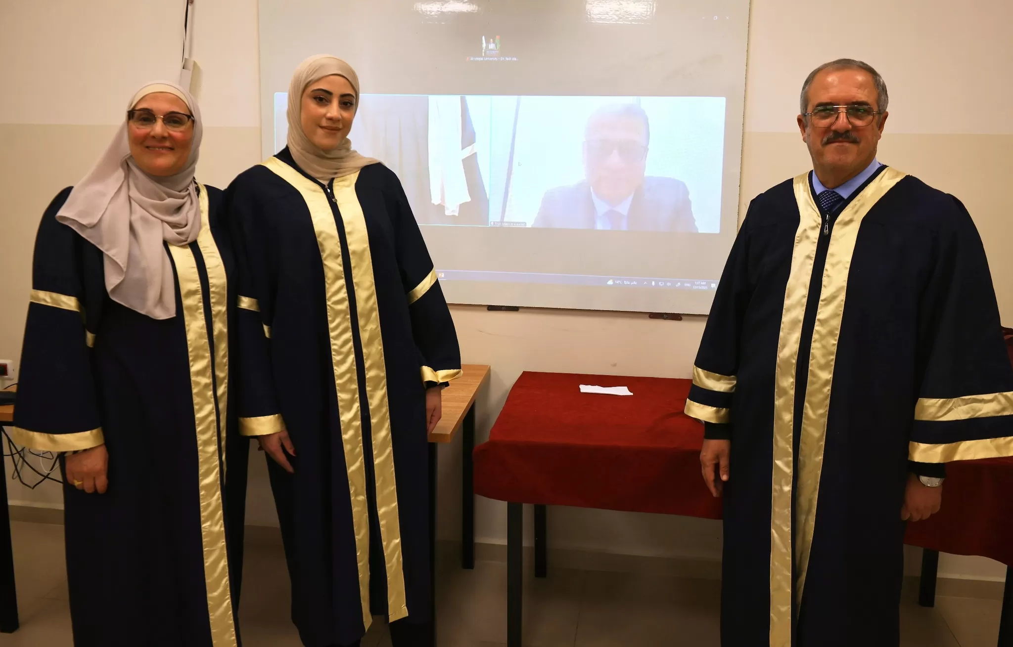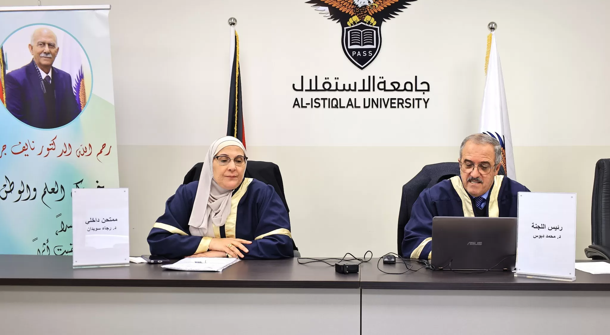 وتكونت لجنة المناقشة من د. محمد دبوس ( مشرفاً)، و د.رجاء سويدان (ممتحناً داخلياً)، و أ.د معزوز علاونة (ممتحناً خارجياً).