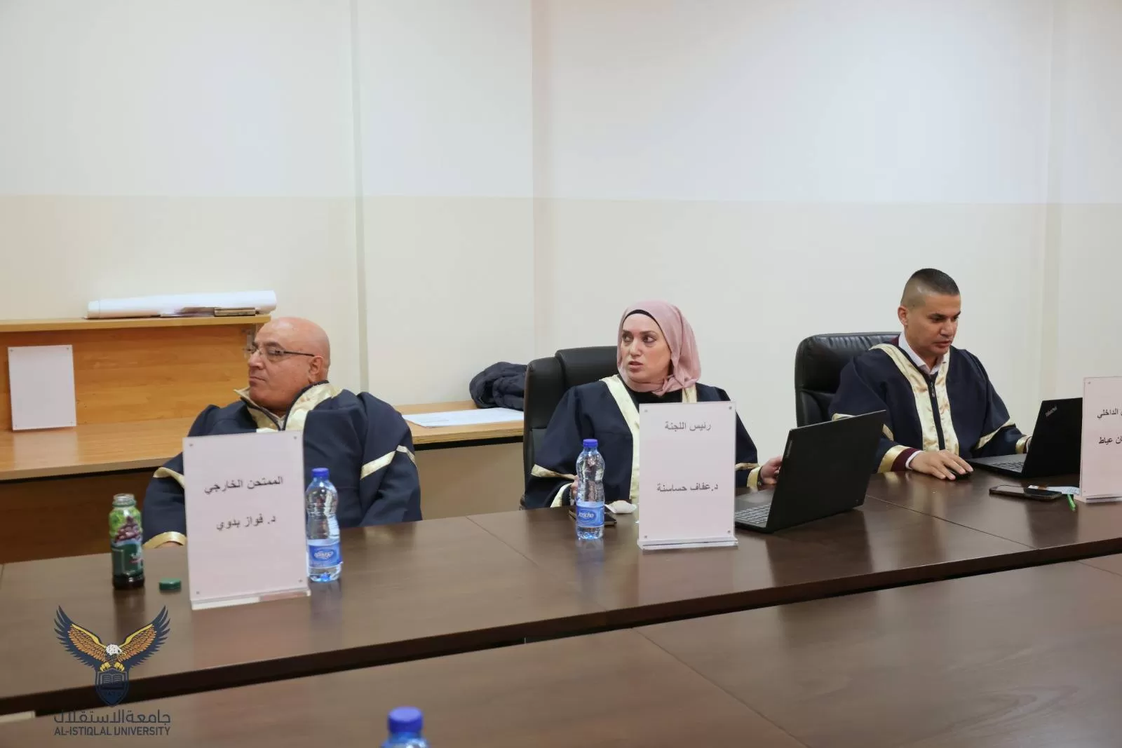 وتكونت لجنة المناقشة من د. عفاف حساسنة ( مشرفاً )، و د. شعبان عياط (ممتحناً داخلياً)، و د. فواز بدوي (ممتحناً خارجياً).