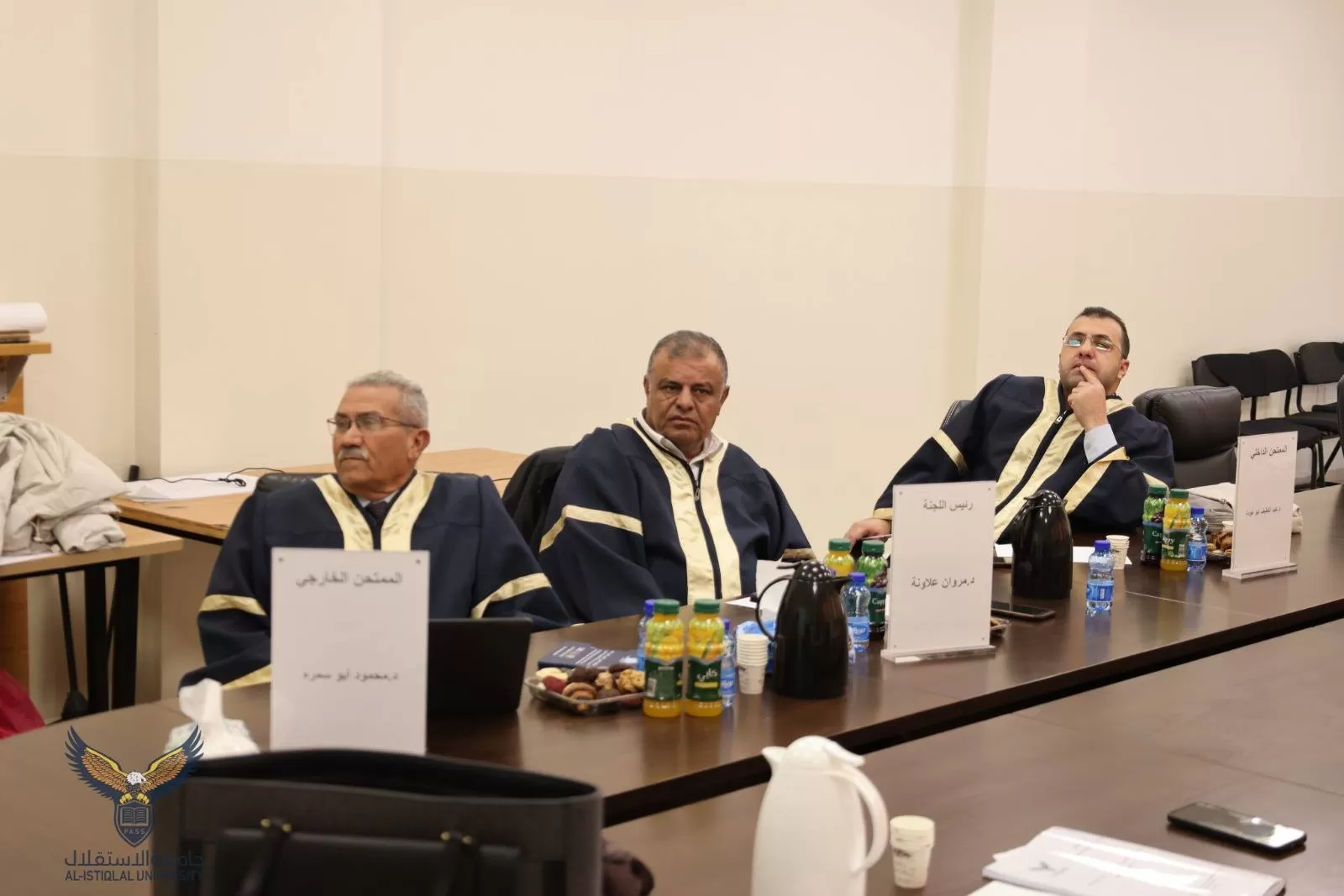 وتكونت لجنة المناقشة من د.مروان علاونة ( مشرفاً )، و د. عبد اللطيف أبو عودة (ممتحناً داخلياً)، و د.محمود أبو سمره (ممتحناً خارجياً).