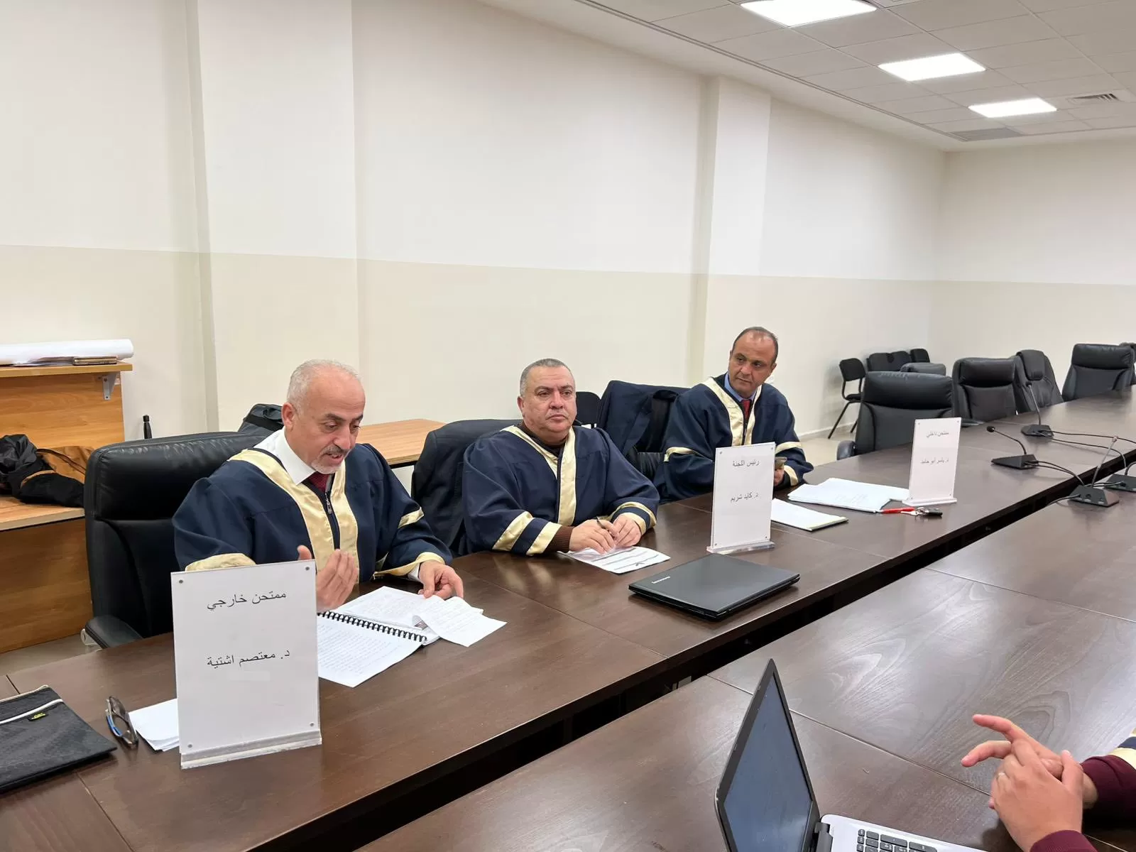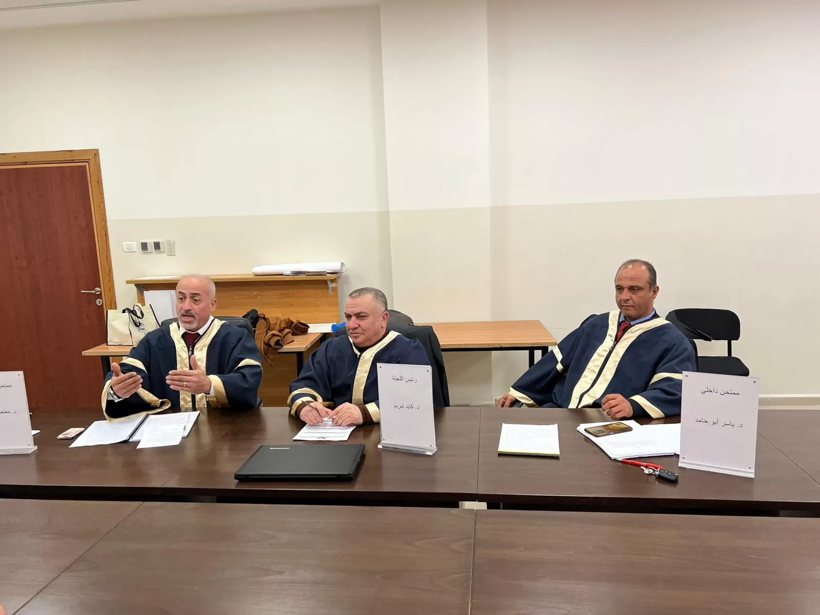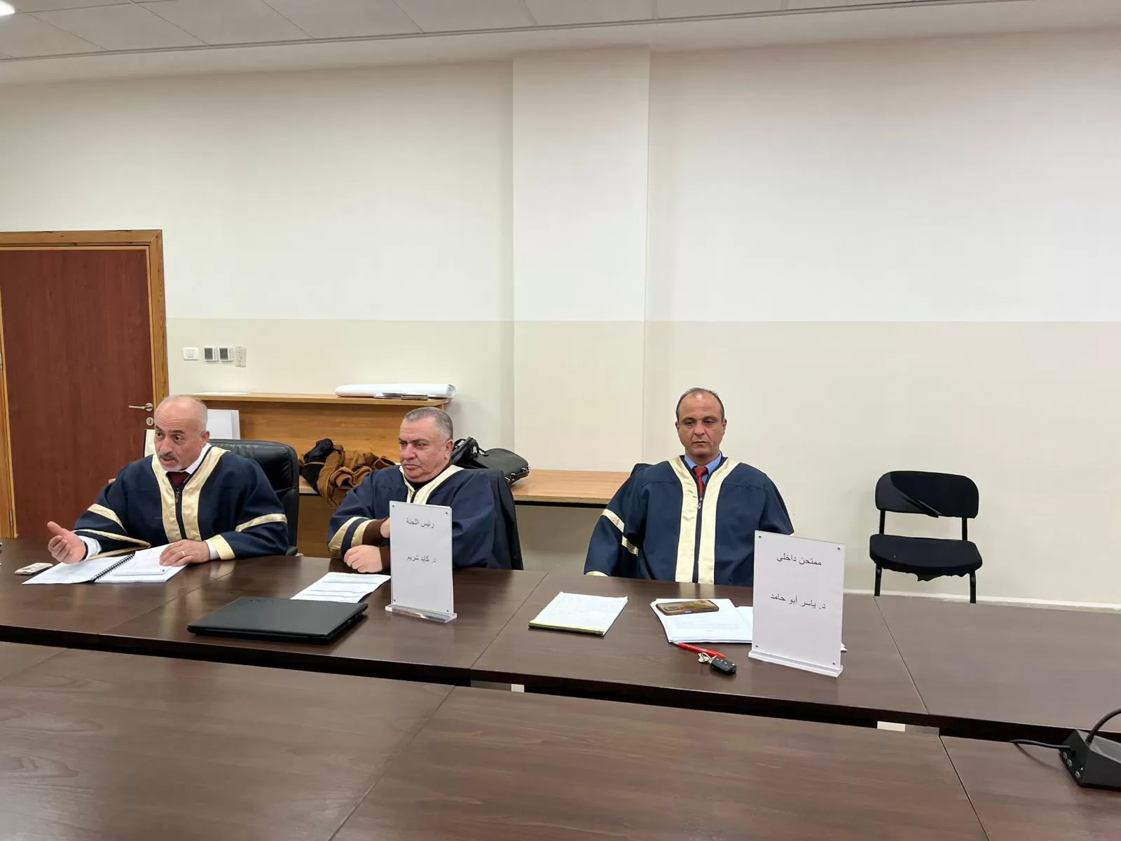 وتكونت لجنة المناقشة من د.رياض شريم مشرفًا على الرسالة، د. معتصم اشتية ممتحنًا خارجيًا، د. ياسر أبو حامد ممتحنًا داخليًا.